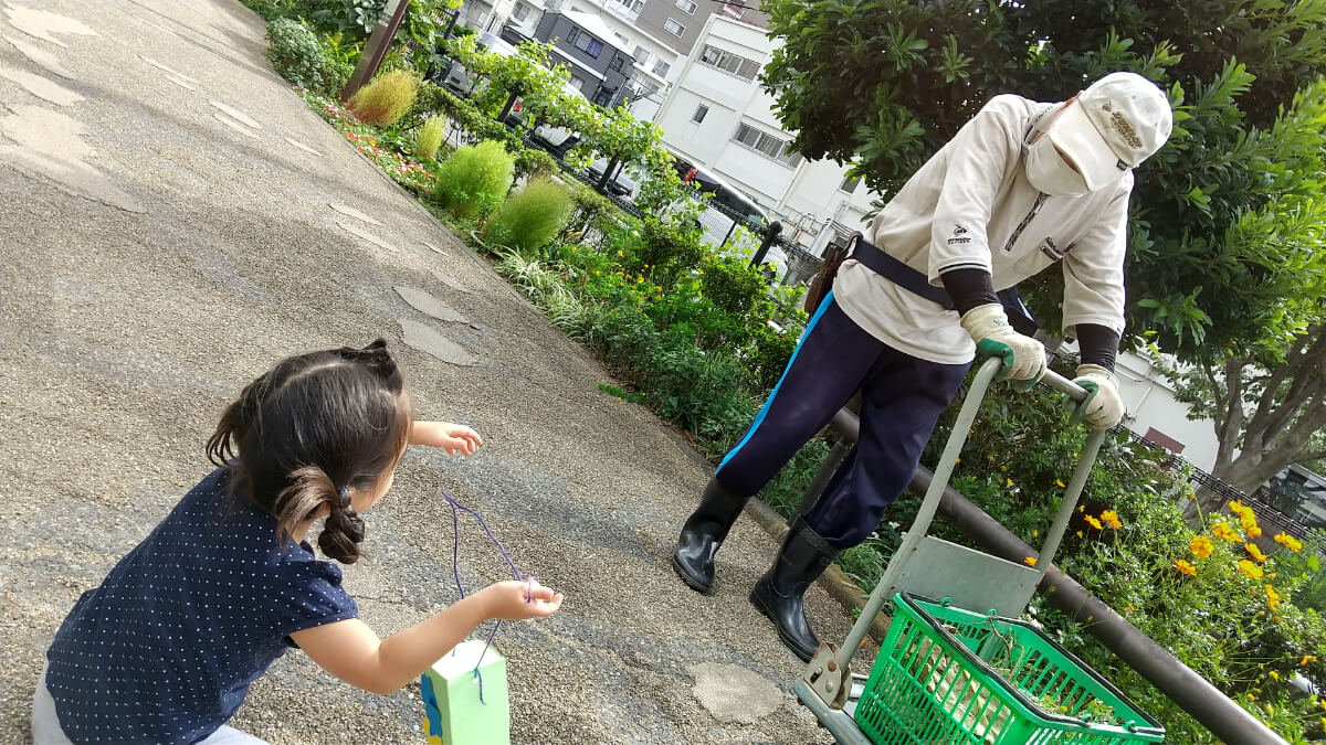 緑道に出ると、いつも掃除をしてくださっているWさんに遭遇。Mちゃんが自分の作ったエサ箱を誇らしげに見せると、それを見たWさんが「かっこいいね」「上手だね」と褒めてくださいました。地域の方にも子育てを担ってもらうことで、「子育てをみんなで楽しむ」という輪が広がったのを感じた瞬間でした。子どもたちも、いつもとは違う大人に褒めてもらえたり認めてもらえたりすることで、さらなる自信に繋がるようです。