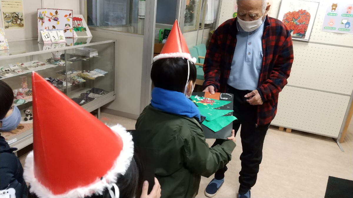 いつもと違う場所に少し緊張気味でしたが、一生懸命作った作品を喜んでもらおうと、「雪だるま描いたんだよ!」とアピール。喜んでもらえている顔を見て気持ちもほぐれたのか、「おばあちゃん何歳なの?100歳まで頑張ってね」などと徐々に会話が弾み、心温まる交流となりました。