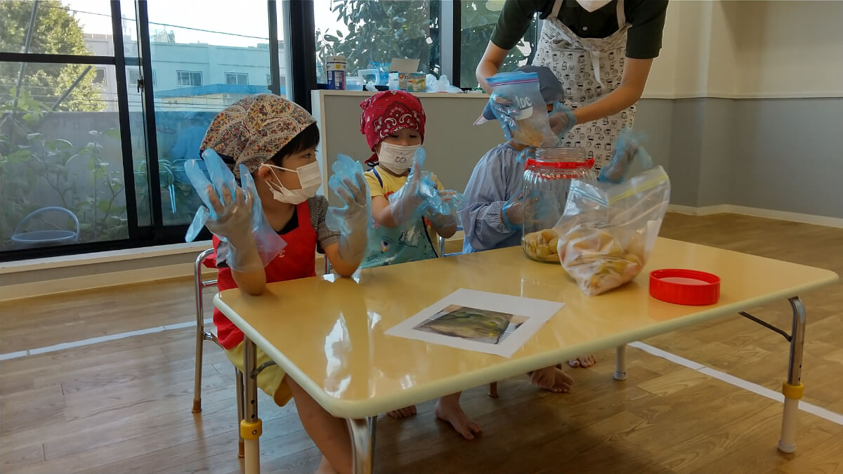 発達支援つむぎ 池尻ルームでは、子どもが食に対して興味を持つことのできる活動を多く取り入れています。ただ調理活動をするだけではなく、時間を置く、発酵させる、混ぜる、加熱するといった工程の中で、素材が変化していくことを観察し、食のふしぎ発見につなげていきます。