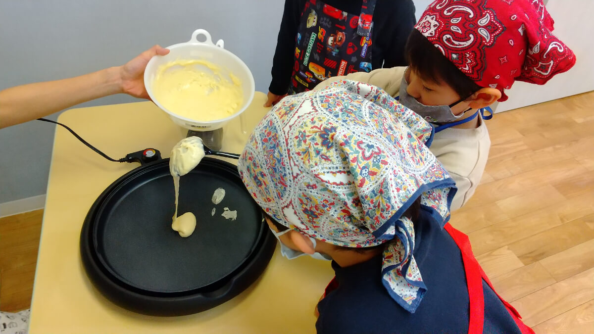 調理活動には、発達を促す要素がたくさん散りばめられています。粉が牛乳と混ざって重たくなっていく様子、熱を加えると徐々に固まっていく様子、いい香り、焦げた香りなどに気づきながら進んできます。道具をうまく使う、熱さに対する危険意識を持つ、友だちと協力する、自分で作ったという達成感を味わうなども目的としています。「卵がうまく割れない…」「上手にひっくり返せなくて、パンケーキがぐちゃぐちゃになっちゃった…」など失敗も多々ありましたが 、それも大切な経験。途中でうまくできなかった工程があっても、「最後まで作りきった!」という達成感を味わうことができるのが調理活動の醍醐味のひとつです。