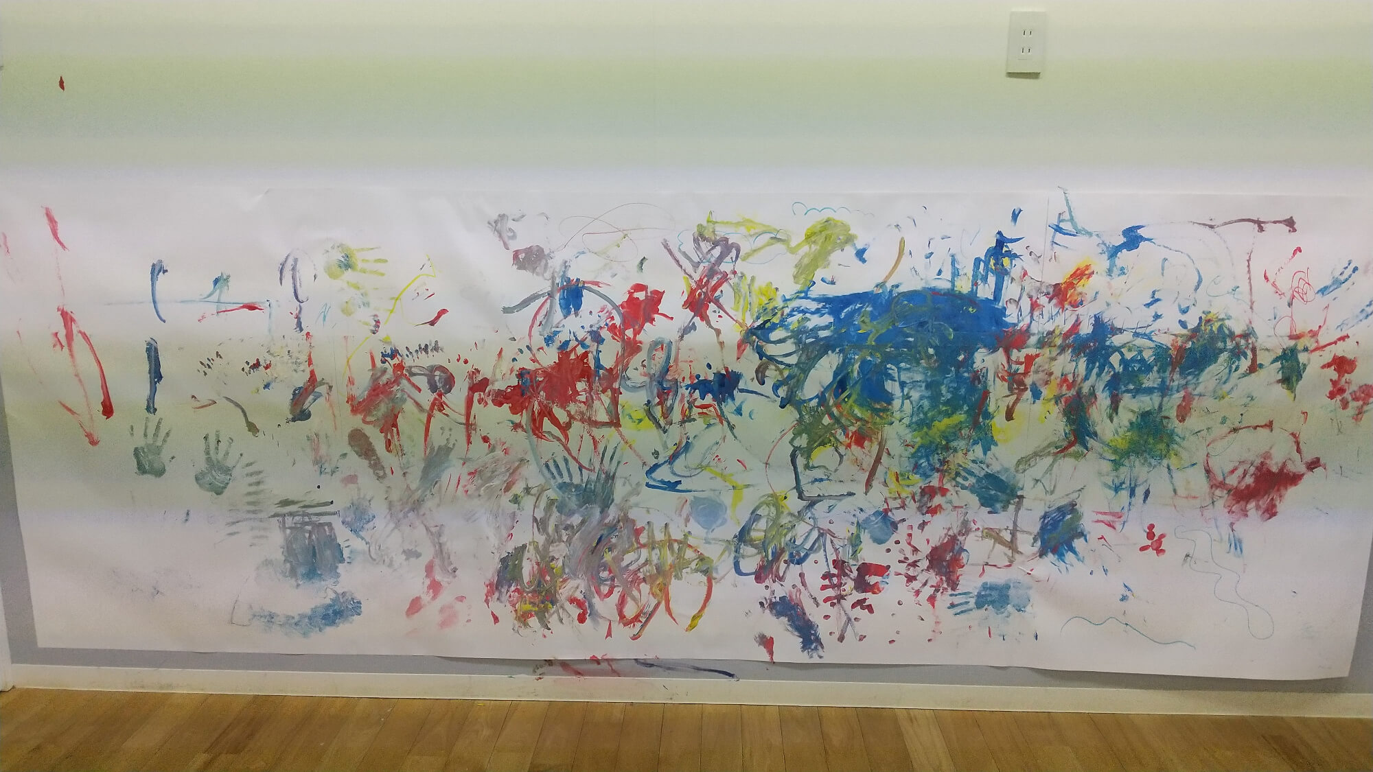 今日の活動では、模造紙をつなげた大きな紙を壁に貼り付け、絵具を用意しました。