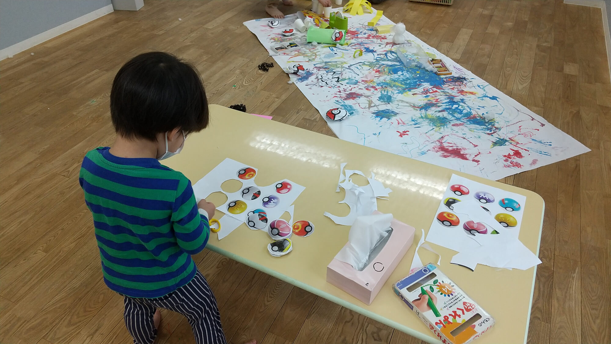 そうすると、子どもたちは目を輝かせて思い思いに表現し始めました。大胆に手や足に絵具をつけてスタンプをする子、指先に少しだけ絵具をつけてお絵描きをする子。なかなか絵具が触れずにいた子も筆を用意すると楽しそうに色を混ぜて楽しんでいました。