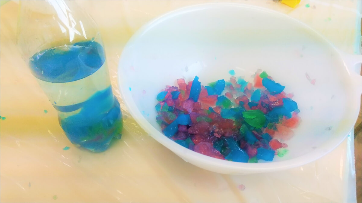 子どもたちは「固まった」「どんな色になったの?」「見せて」「手にベタベタついて離れない」「全部の色を混ぜたい」「水を入れすぎてドロドロ」「うまく型から離れない」など、さまざまな感じ方を表現します。解決策を考えたり、他者と感想を分かち合ったり、やりとりする場面が生まれました。