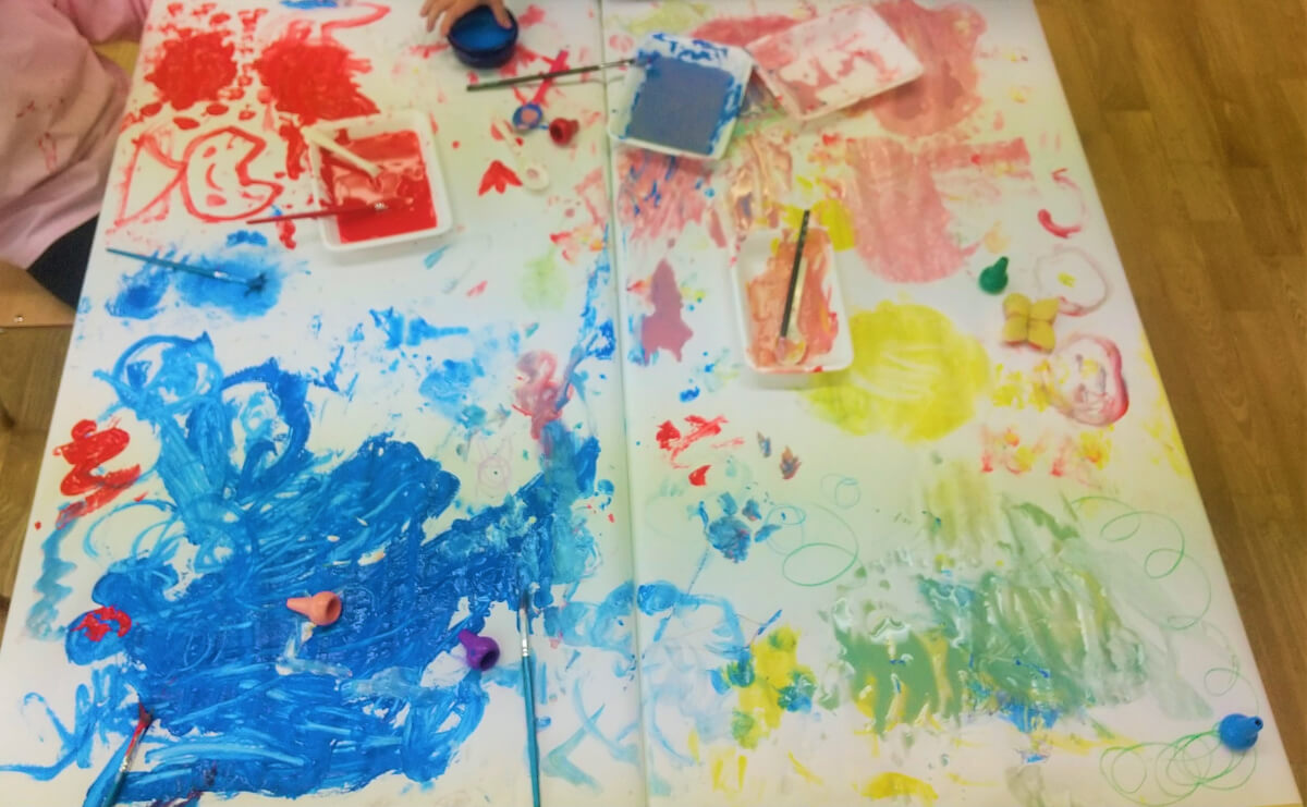 これまでは、触ることに抵抗を感じていた子が、この日は筆を持って絵の具をぐるぐる混ぜる様子がありました。苦手な感覚や感触も、方法や道具を変えたり、少しの工夫をしたりするだけで、今までできなかったことができるようになることもあります。
