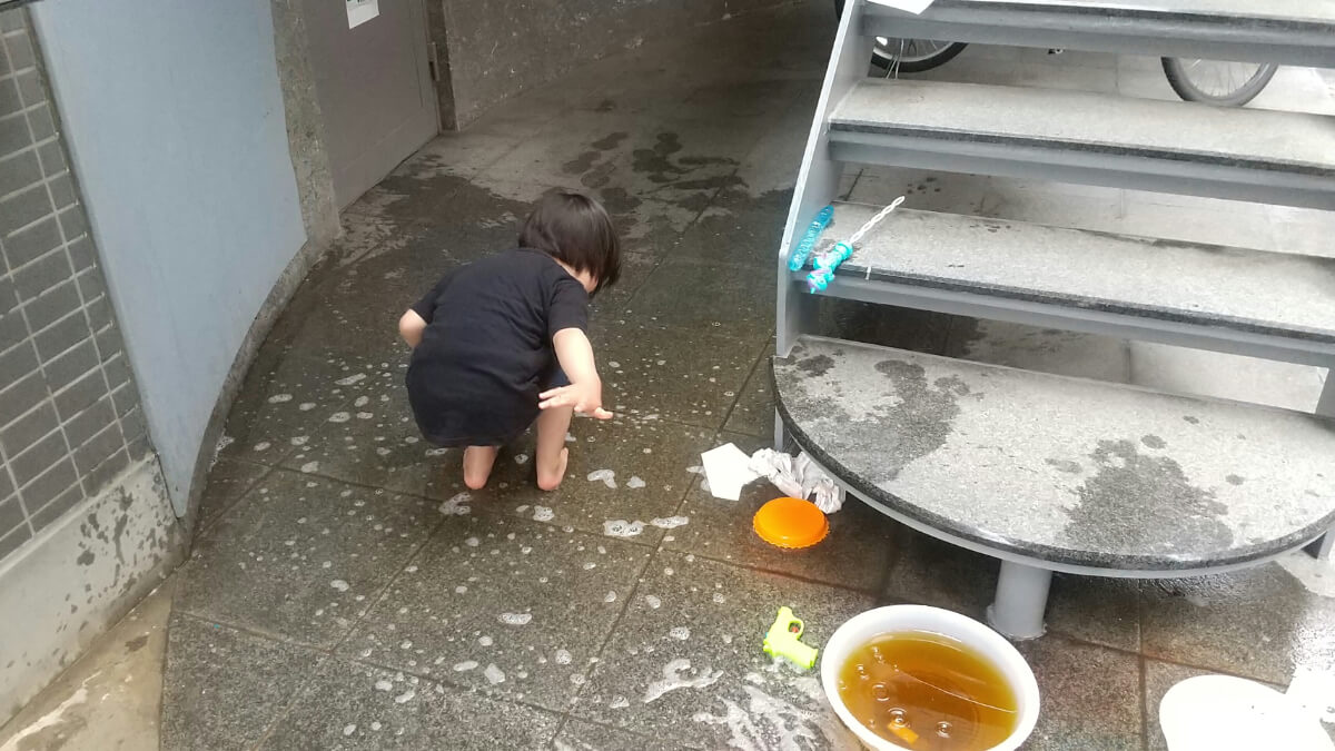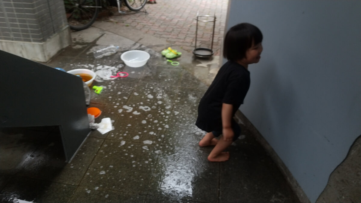 発達支援つむぎ 池尻ルームはテナント型の事業所ではありますが、室内ではなく、戸外に積極的に出かけています。そして、シャボン玉遊びや色水遊びをするのも玄関前のスペースを活用し、遊ぶこととしました。