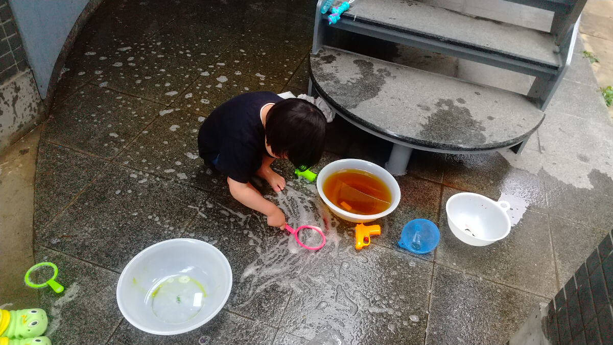 Cちゃんは小さな玄関スペースさえも、水遊びが出来る楽しい場所に変えてくれました。スペースがないから水遊びが出来ないと決めつけていたのは、大人の勝手な思い込みであり、「この場所ではこの遊び方しかできない」と視野が狭くなっていたことに気づかされました。こうして子どもたちから教わることも多く、大人も子どもと一緒に学んでいるのだなと思いました。生活に根ざした活動を取り入れながら、想像力を働かせ、楽しみながら学び、生きる力を育めるように、これからも日々、子どもたちと一緒に成長していきたいと思います。