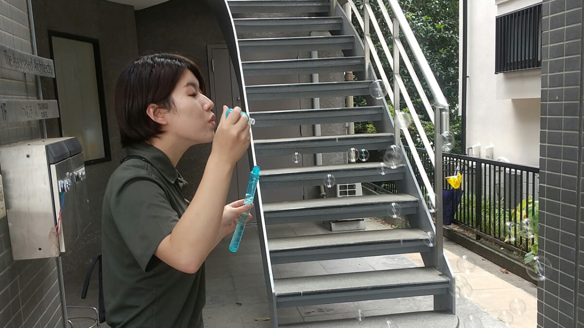 スタッフが吹いたのを真似してCちゃんも吹きますが、最初は上手にできません。でも諦めることなく、ふぅと息を吐いて、たくさんのシャボン玉を飛ばすことが出来ました。太陽の光でキラキラと輝き、風に乗って飛んで行くのを見るCちゃんの目はとても嬉しそうに輝いていました。