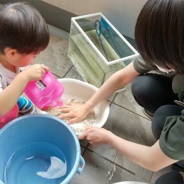 川の魚に餌やりをしたり、砂遊びをしたり、ごみ拾いなどをすることで体をコントロールする力、道具を操作する力、手先を使う力を養います。