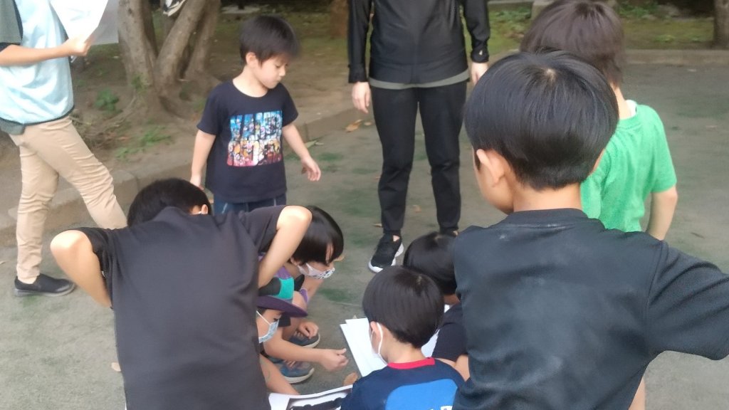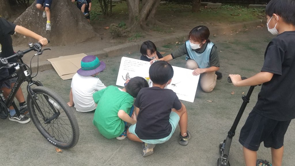 まずは、子どもたちで公園に遊びに来ている地域の方に宣伝をします。「これから絵本の読み聞かせを行うので、来てくださーい」と声をかけると、地域の小学生が集まってきました。