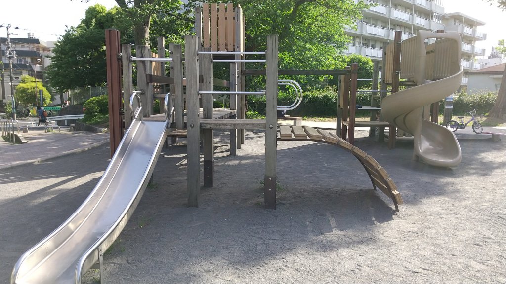 淡島通り公園の 通りをはさんで向かい側にある公園です。アスレチックとボール遊びのできる広場があります。アスレチックは、頭をぶつけないようにかがんで通り抜けたり、腕の力を使って上がったりと、身体感覚や全身の力を養うことができます。