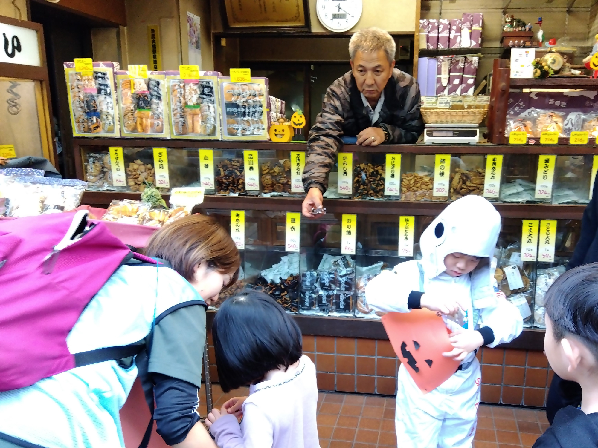 ハロウィンイベントで仮装してお菓子を受け取る活動でお煎餅屋さんではいつも優しい店主さんが迎えてくれます。