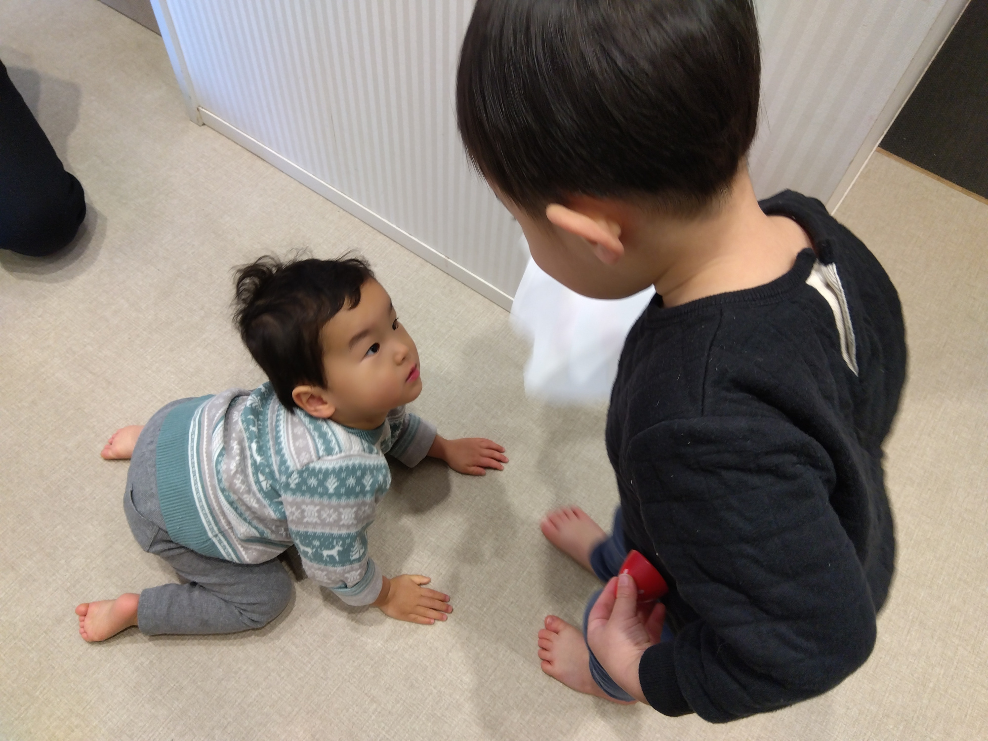 年が明けるころには、自発的に友達に対して「遊ぼうよ」と声をかけて一緒に遊ぶ様子が見られてきました。自分より年下である友達に対してその子が好きなものを持って行って「遊ぼう」と声かけたり、「僕がやってあげるよ」と遊びを見せてあげたりする様子も見られてきました。