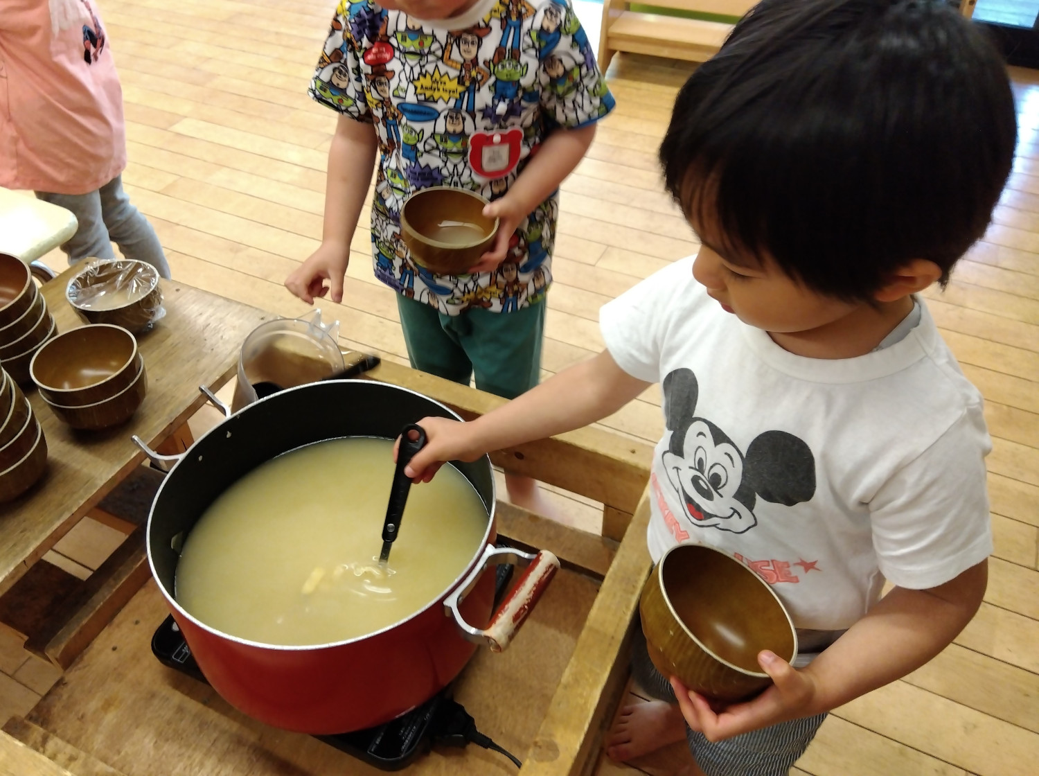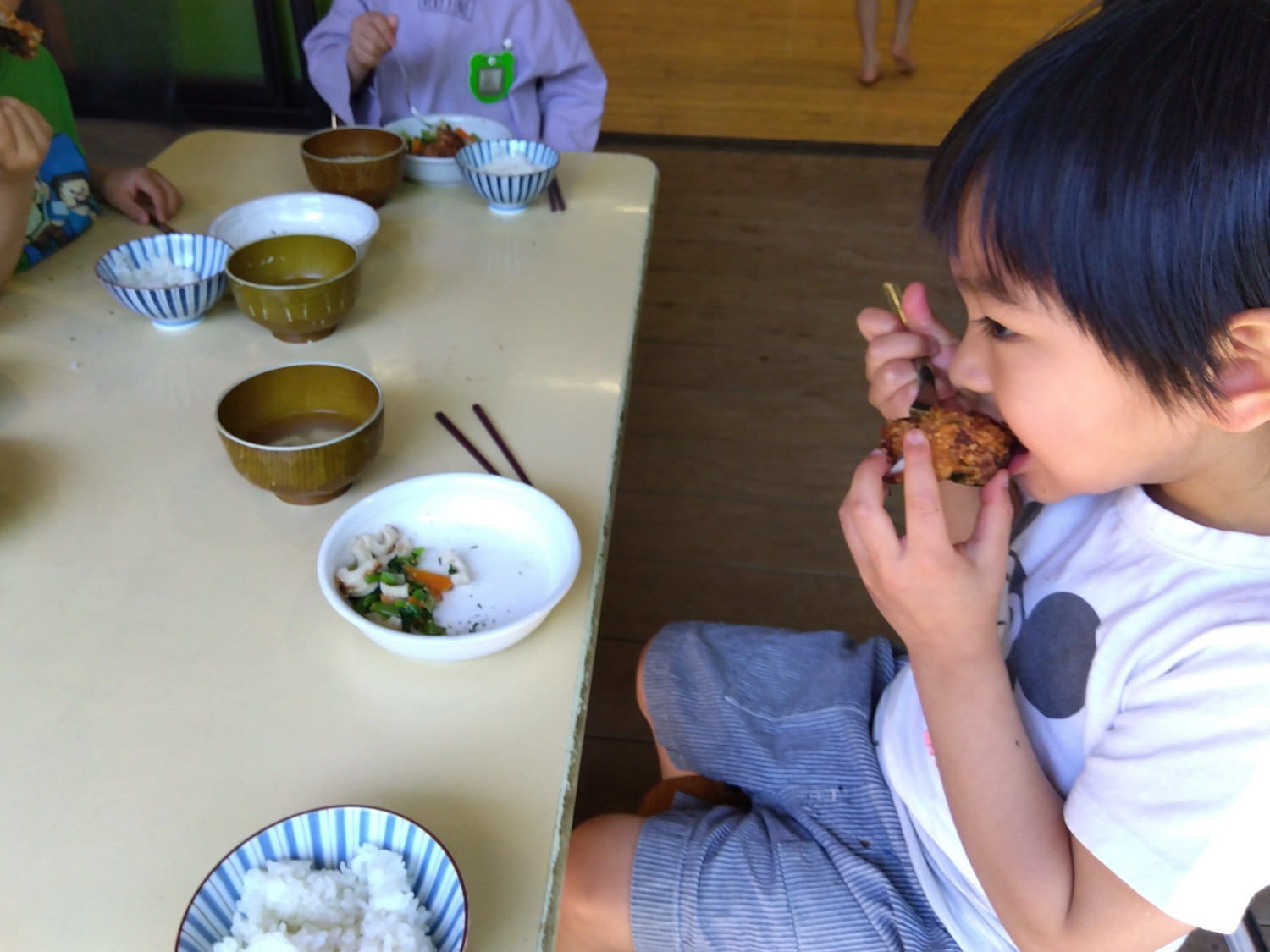 また、初めて自分の分の給食を盛り付けする経験や友だちと一緒に食事をする経験を行い、家庭ではあまり口にしなかったご飯や野菜を食べることに挑戦する姿が見られています。