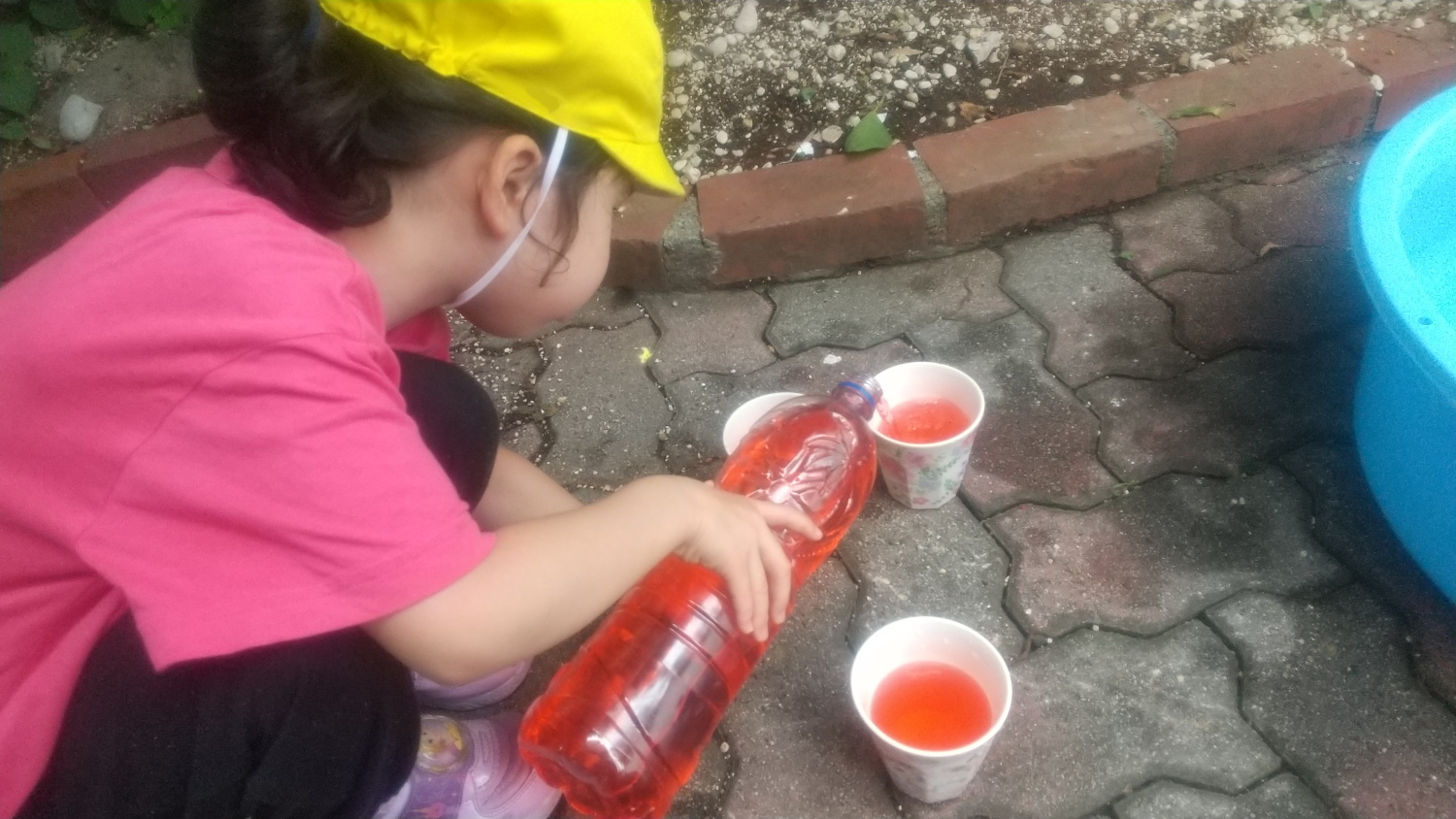 おままごとが好きなAさんです。室内に並んでいた色水が入ったペットボトルの中から赤い色水が気に入ったのか、それを抱えて外に出ました。外に出ると、色水をジュースに見立ててコップに注ぎ始めました。最初は自分のコップだけに注いでいましたが、このあとスタッフが別の器を差し出し、ちょうだいとお願いしてみると、分けてくれました。