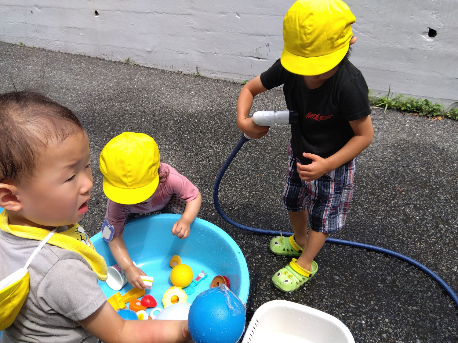 いつもは別々に遊ぶことも多い子どもたちですが、この日はみんながたらいの周りに集まっています。ホースから出る水を自分にかけようとしてみたり、たらいからボールを取り出して「あお」と言ってみたり、気になるおままごとの道具を手に取ってみたり、それぞれ興味のあることに夢中になっています。