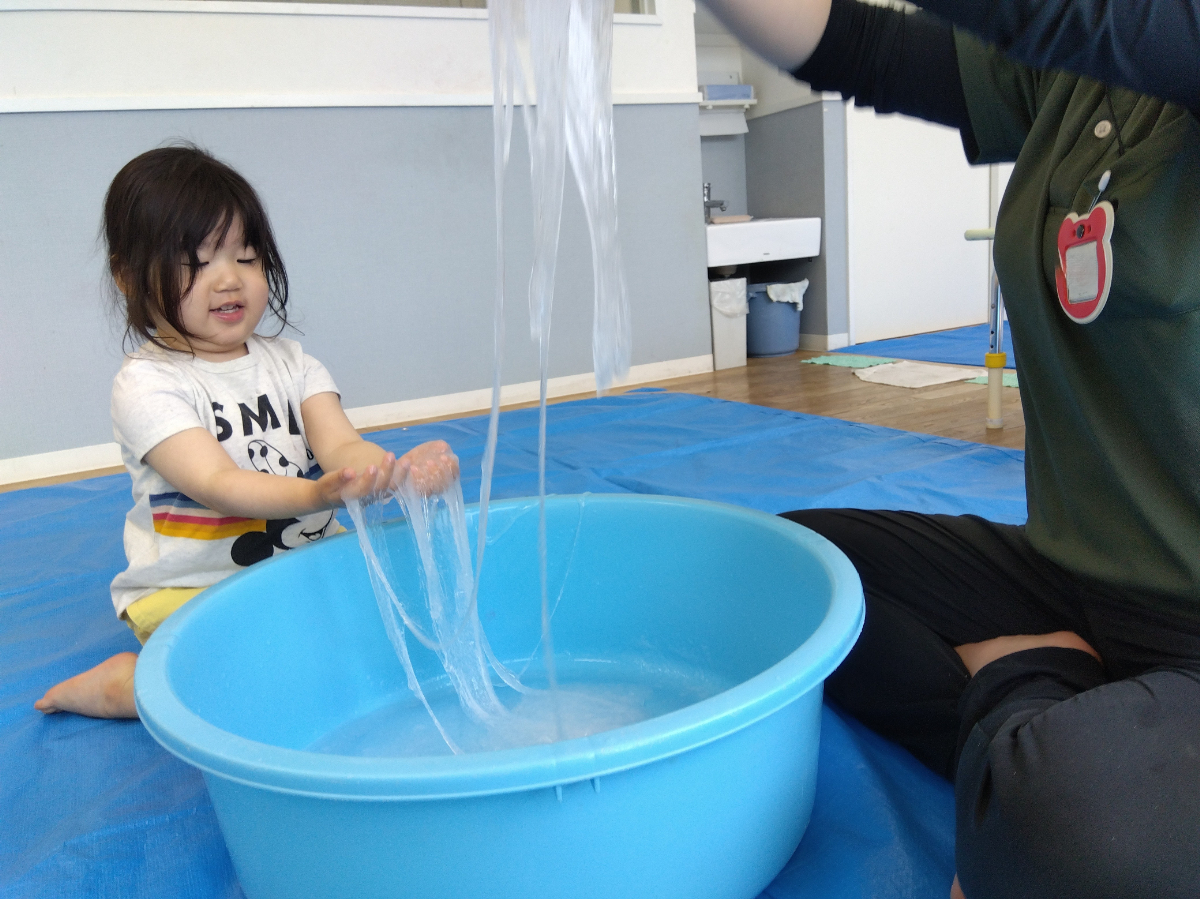 スライム遊びの場面では、子どもから歓声があがりました。たらいに入っている特大スライムが目の前で流れる様子を見て「大きい」と驚きを言葉にして伝え、両手でグニョグニョと感触を確かめていました。
