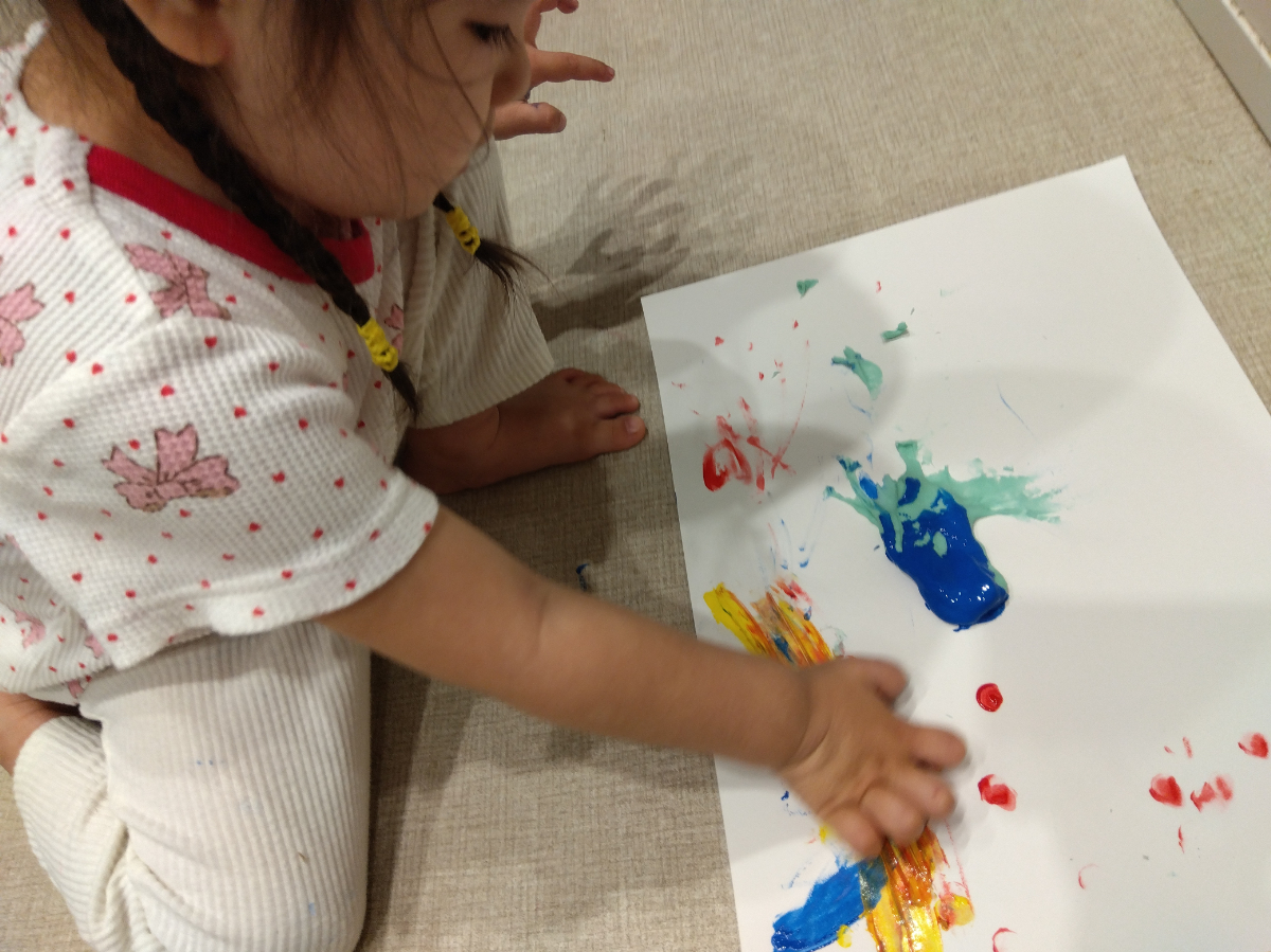 絵の具のコーナーでは、紙の上の絵具を指先で伸ばす姿もみられました。指先に感じる絵具の感触、指の動きに合わせるように模様が作り出される様子を何度も確かめていました。