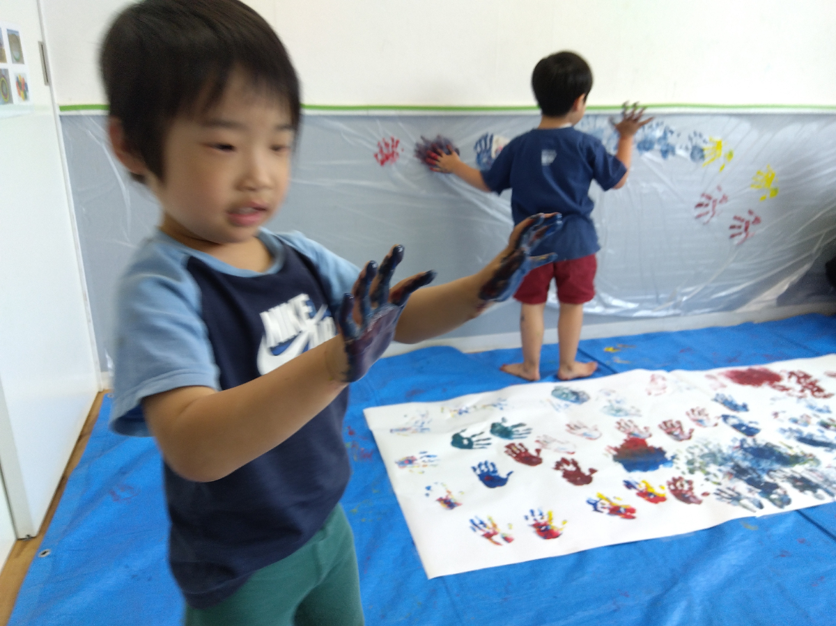 両手いっぱいに絵の具をつけて、ヌルヌルとした感触を感じるとともに目にも鮮やかな色を見て、興奮気味な子どもの姿がみられました。その後、色とりどりの手形をつける遊びに参加し、ダイナミックな作品が仕上がりました。