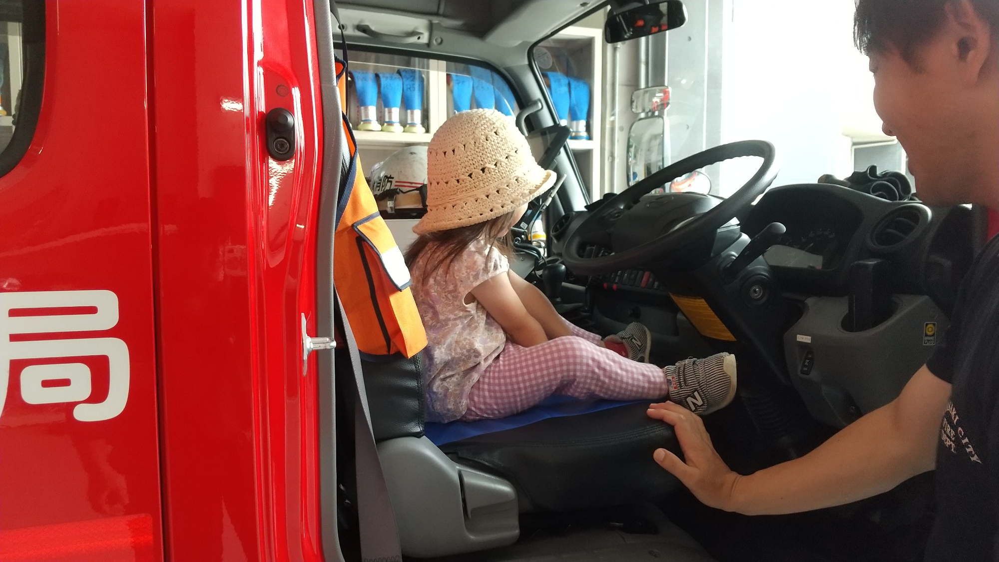 去年は怖さから消防署内に入れなかったCちゃんも、Bくんの姿や消防士さんの雰囲気に背中を押され、ついに消防車に乗ることができました。