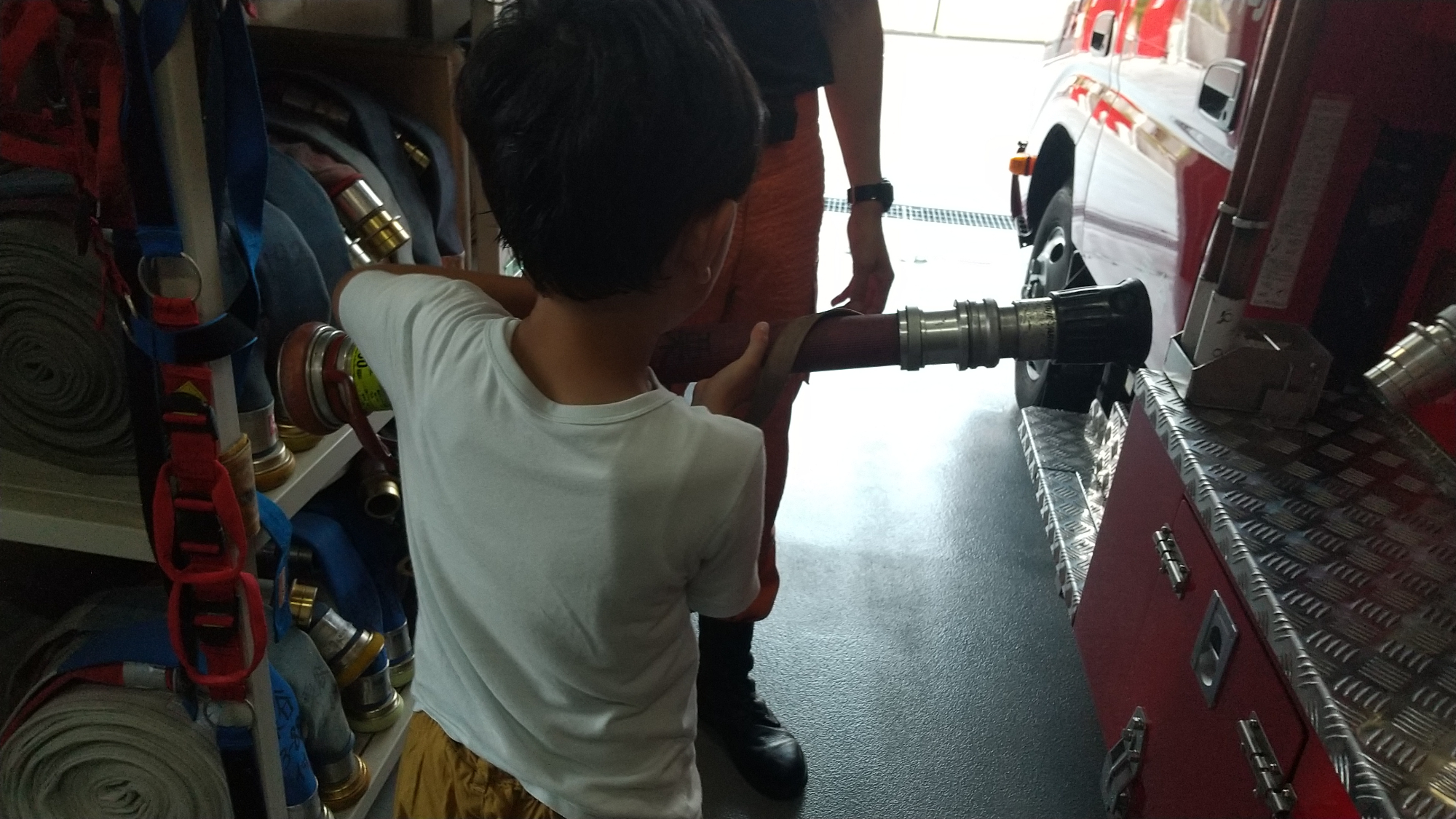 「これは何?」とAちゃんが消防士さんに尋ねると丁寧に説明してくださいました。