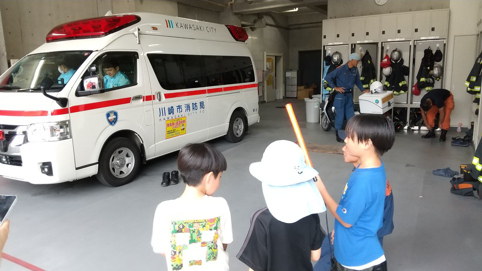 見学中に救急車が出動することになり、消防士さんと一緒に子どもたちも誘導棒を持って、救急車を誘導することをしました。