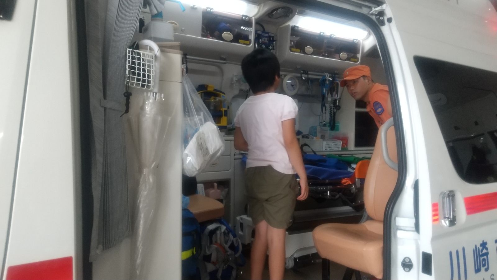 救急車に乗せていただき「ここに寝てもらって、病院まで運ぶんだよ」と説明を受けた後、救急車の中をじっと観察し、吸引器を指さして消防士さんに「これは何?」と気になったことを質問していました。