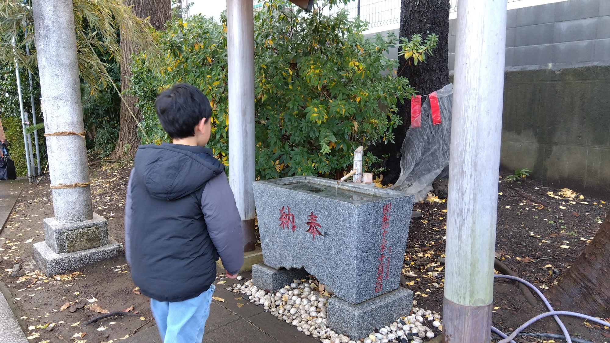 行先は、五反田神社。生田ルームからは子どもの足で20分ほどの場所の神社です。出発前に参道の歩き方や、手水舎とひしゃくについて学び、参拝の練習を行いました。