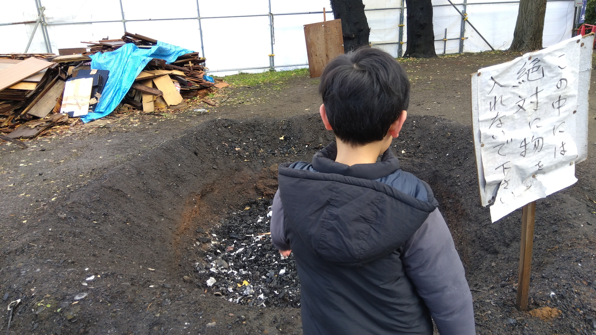 燃えカスの残る大きな穴を見て、「これは何?石炭?木炭?」と質問をする子がいました。「お焚き上げって何?」「そのまま埋めるのかな?」「何を燃やしたんだろう?」と疑問がどんどん出てきました。