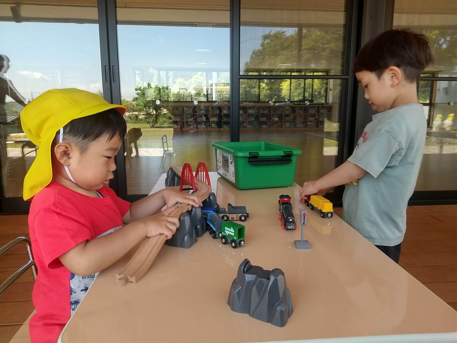 5月より、マンスリー支援がスタートしています。電車遊びが大好きな子同士が自然に集まるようになり、身振り手振りも交えながら「貸して」「いいよ」と言葉のやり取りも少しずつ見られます。線路のつなぎ方に困ったときに、スタッフが「ここをこうしたらどうかな?」と提案すると、とても嬉しそうに線路をつないで遊びを展開しています。