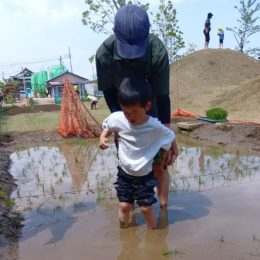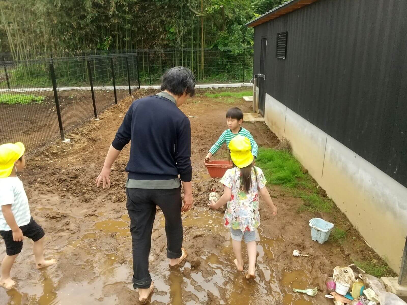 放課後等デイサービス利用も始まりました。土曜日に利用している児童はどろ遊びが大好きだということで、すぐに裸足になり、保育園の子と一緒になって、大きなケースにどろを入れて運び、水たまりにもバシャバシャと足を踏み入れ、飛び散るどろ水もなんのその、思いきり楽しんだ一日でした。
