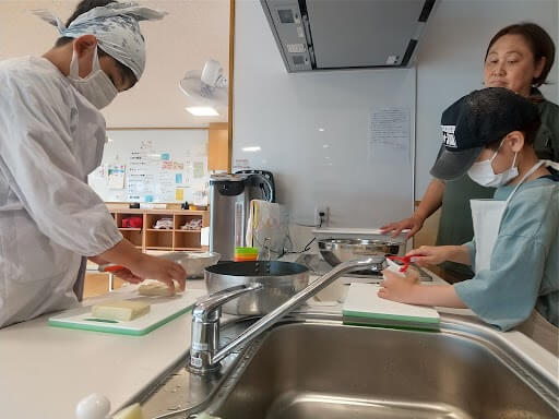 夏休み中は放課後等デイサービスの子どもたちは園で生活する時間も長くなります。生活力や自立心を育む「自分でできる事は自分で」という想いも含め、食事の準備を一部行ったり、食後の洗い物を協力して行ったりしています。手作りうどんにも挑戦しました。