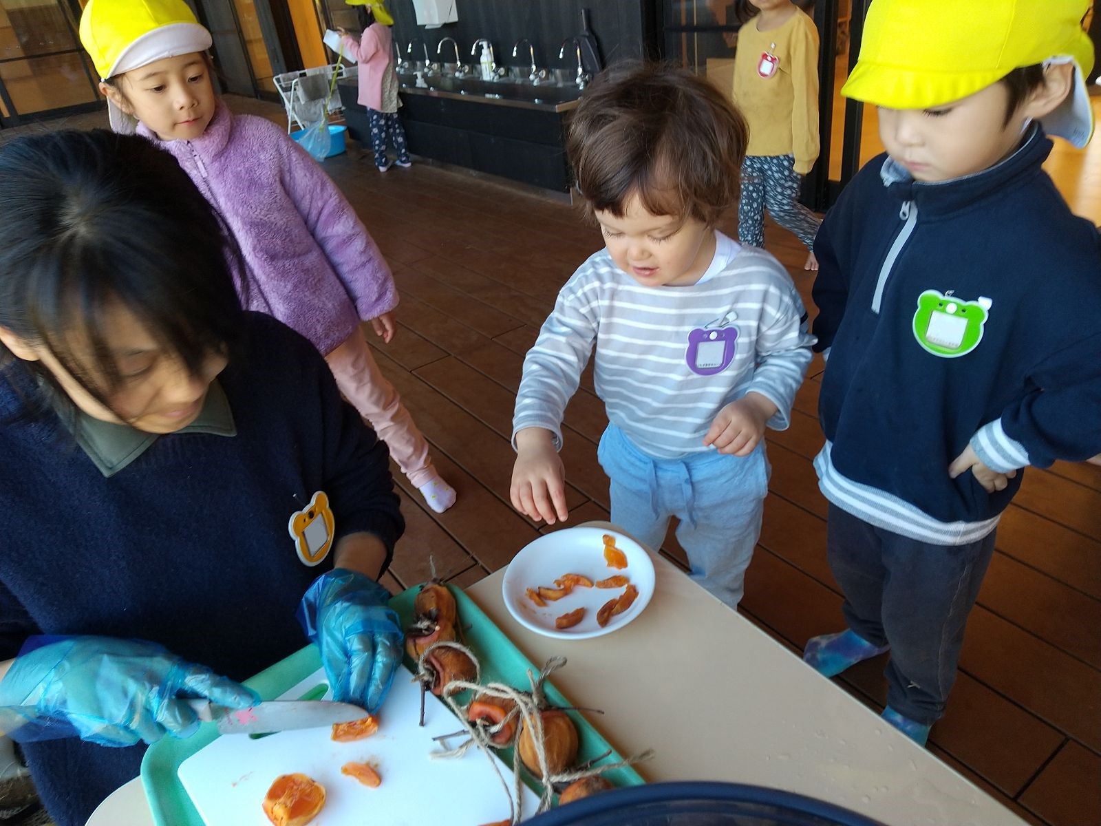 渋柿を食べたときには、「口の中が変な感じ」「たべられないよ」と話していた子どもたちでしたが、柿の変化に興味を示して、食べてみようとチャレンジすることができ、「おいしい!」「甘くなってる!」という味の不思議な変化にも気づくことができました。