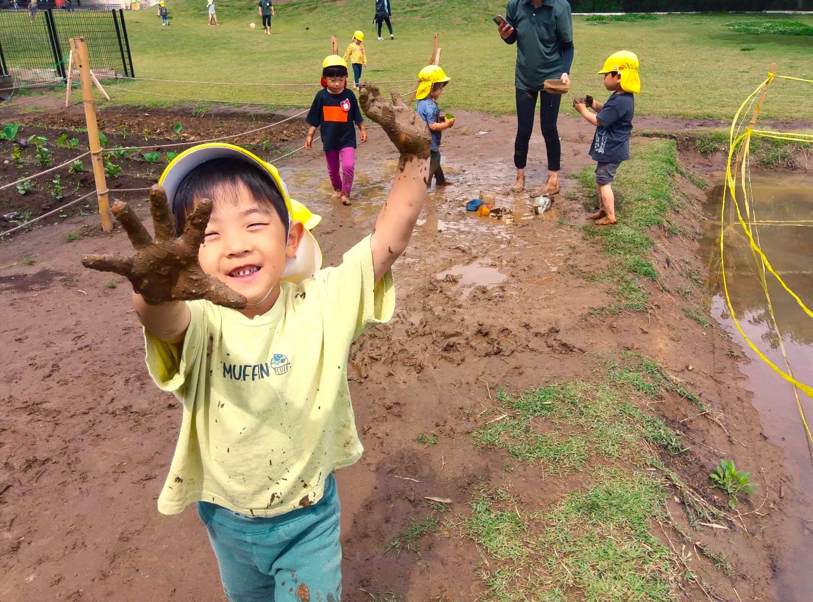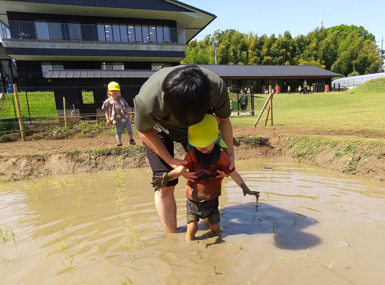 田植えの前はどろんこで遊ぶ、にこにこの子どもたちです。「田植えはまだかな?」「はやくやりたいな」とどろんこ遊びを満喫しながらわくわくの気持ちでいっぱいです。