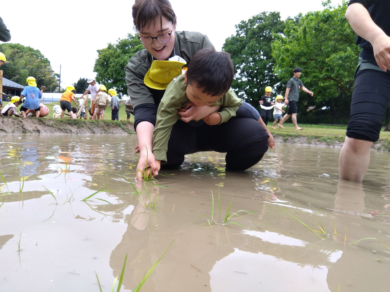 初めての田んぼは足がすぐに埋まり、ぐにゅぐにゅした不思議な感触です。初めての感触に驚きながらもスタッフと一緒に丁寧にまっすぐ植えることができました。汚れることが苦手で、苗を落とすだけの子どもたちもいますが、笑顔で体験することができました。