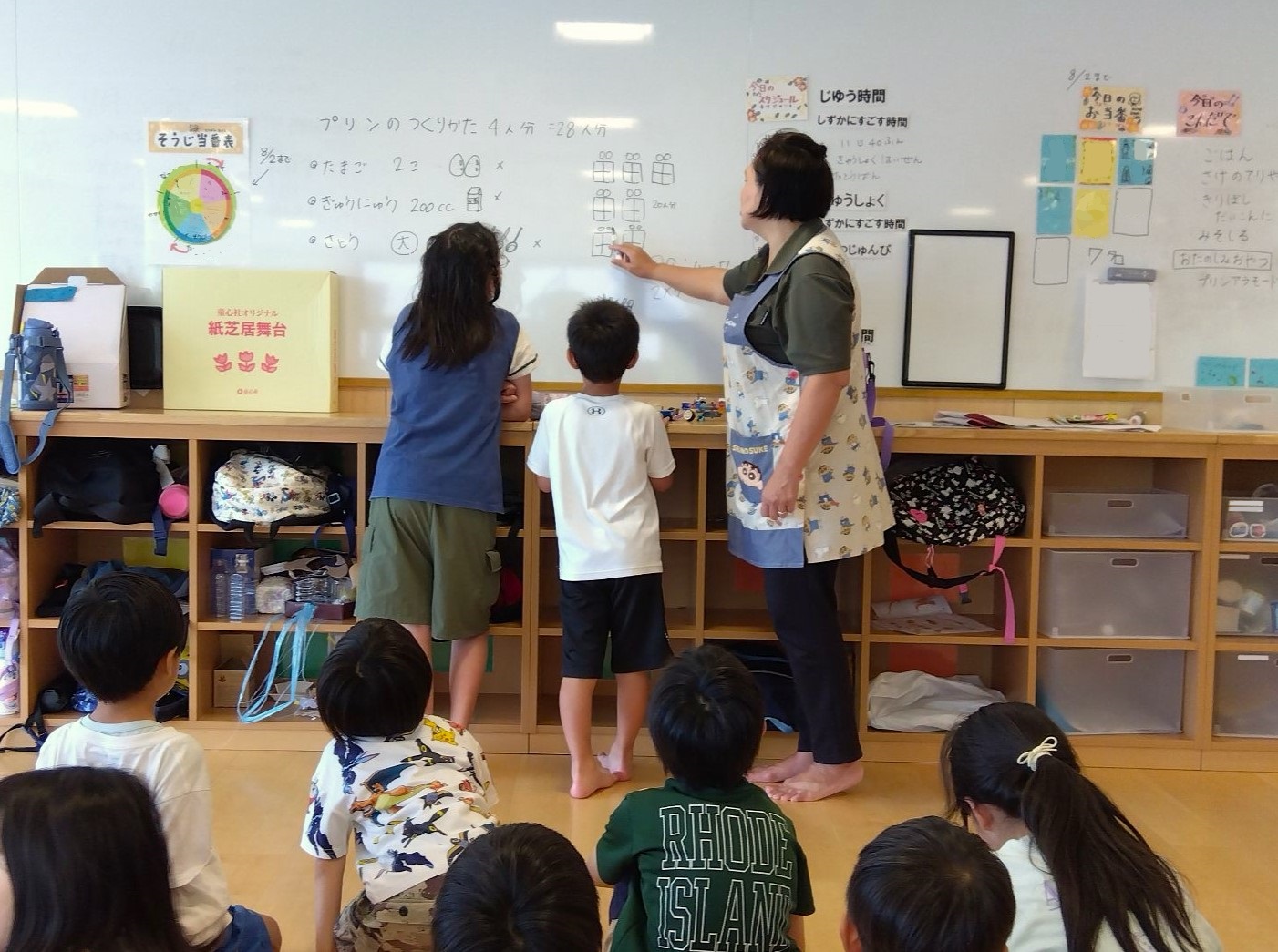 夏休みは調理活動なども多く予定しており、プリンアラモード作りでは当日28人分の量について子どもたちとホワイトボードに書いたり、子どもたちが考えたりして適量を導き出しました。