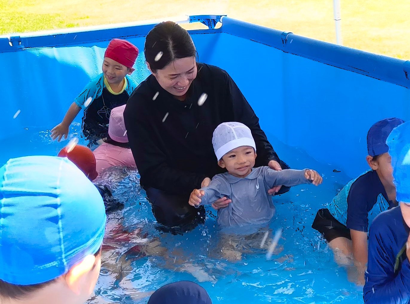 午前中は学童・放デイは二階の児童室、幼児は一階の幼児室に分かれます。つむぎの幼児も園児と一緒にプール遊びや水遊び・泥遊びなどで体をいっぱい使って遊びます。