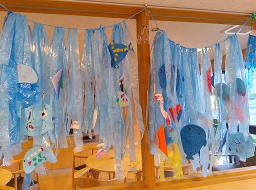 天気が悪い日は涼しい室内で水の中の生き物を絵に描き壁面に飾り、絵を眺め指をさしながら「クラゲだ!」「魚だ!」と嬉しそうでした。