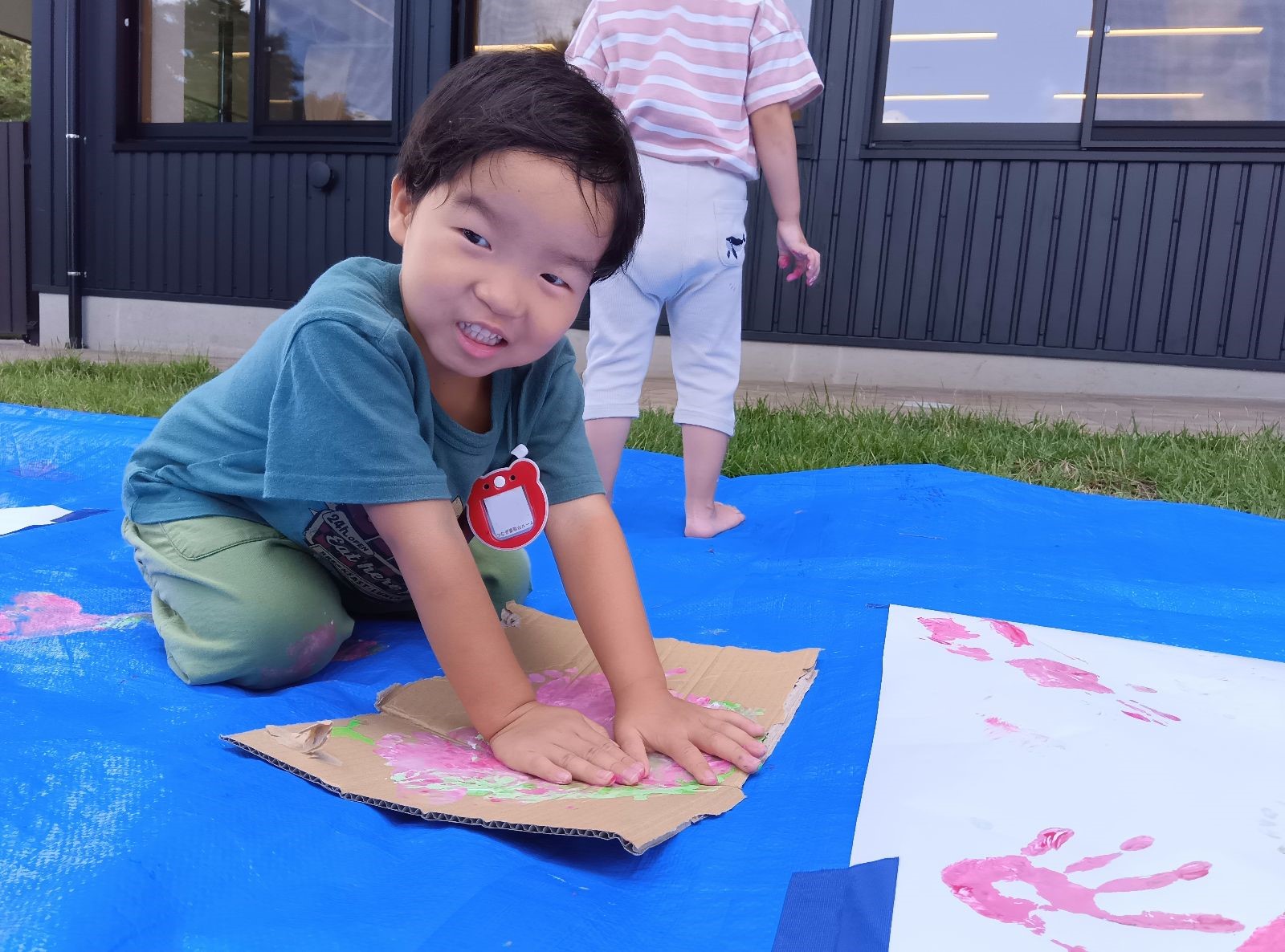 天気が良い日の午前中、建物の日陰に大きな紙を広げみんなでいろいろな色の手形アートを思いきり楽しみました。