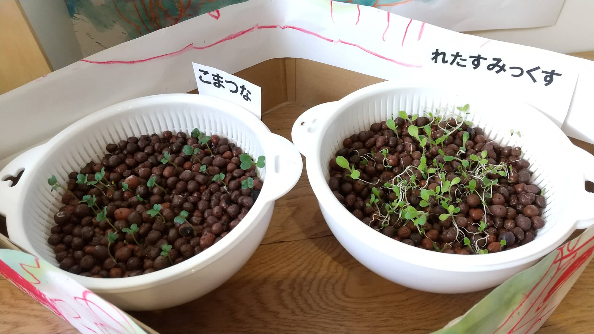 みんなで一緒に絵をかいて、カフェスペースにある水耕栽培コーナーが完成しました。