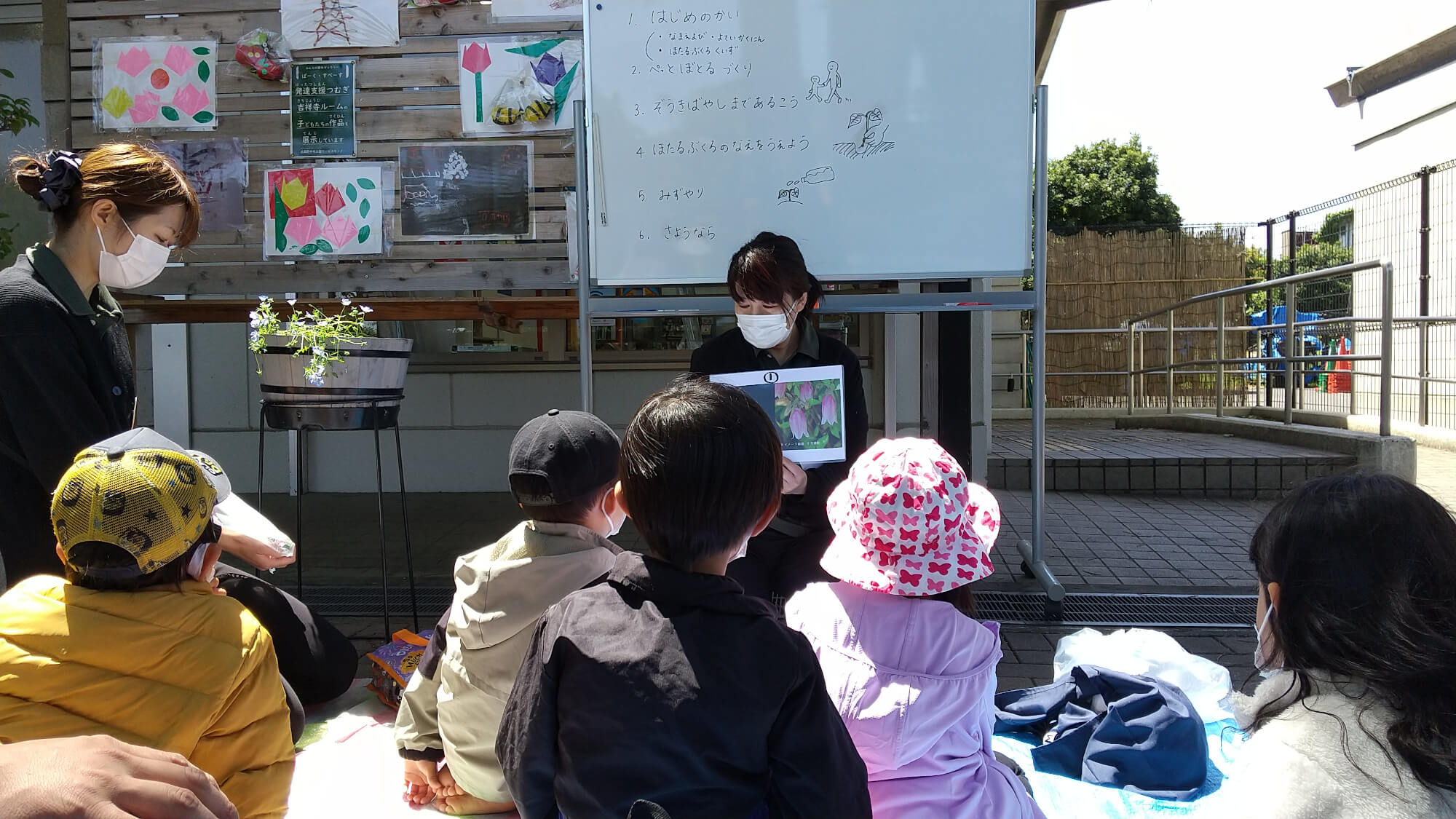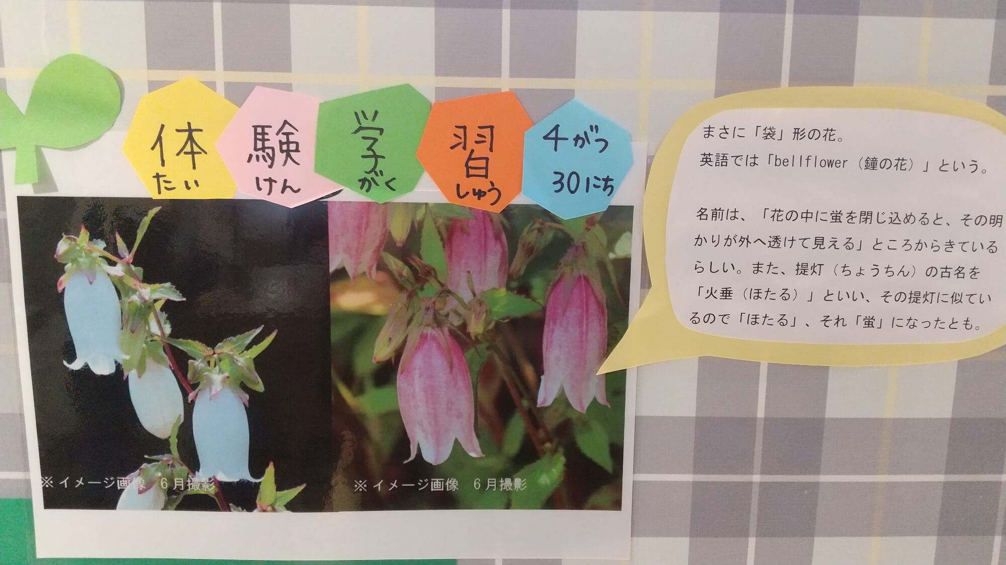という声が聞こえましたが、すぐにパネルを用意し「ほたるぶくろの花はどれかな?」「名前の由来は?」などのクイズを出すと子どもたちの目がキラリと光り、注目が集まります。どんな花なのかを一緒に調べ、知っていくことで植物に関心を持つことや身近に感じることができますね。