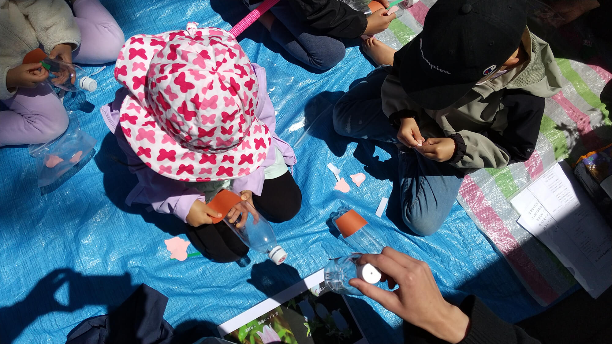 ほたるぶくろがイメージできるように画用紙で花や茎、葉などを用意したものをペットボトルに貼っていきます。指先を使って両面テープをつまみ上手に剝がしていきます。見本を見て同じような位置に花を貼る子や、自分の考えた位置に花を貼るなど、個性豊かなペットボトルのジョウロが完成しました。