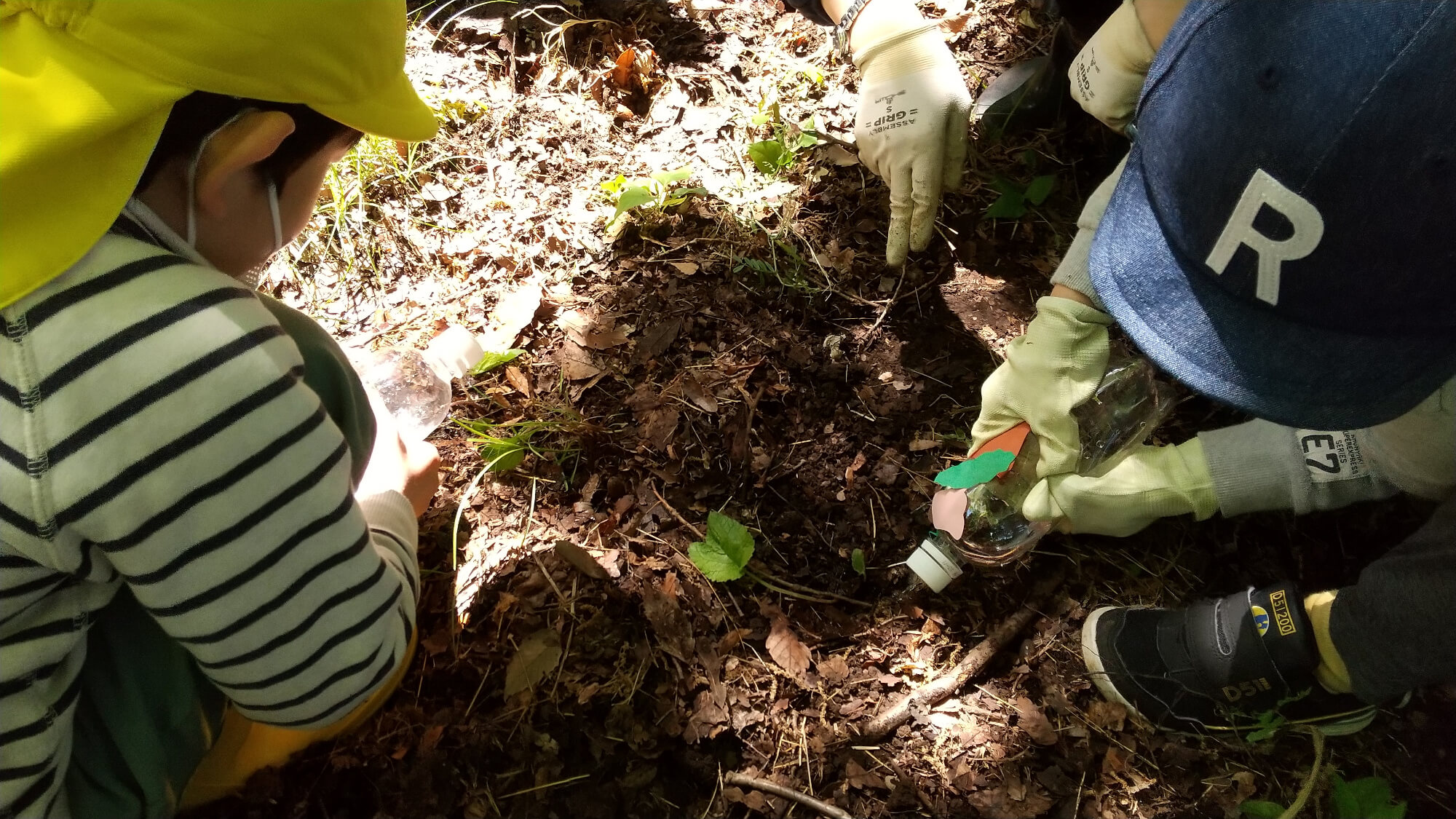 シャベルで苗を植える穴を掘りますが、雑木林なので土壌にしっかり根が張っています。なかなかシャベルが土に入らず掘るのに苦戦しました。掘るためには、シャベルをしっかり握ることや土を掘りだす手先の操作、力のコントロールが必要です。「ほたるぶくろを植えたい」という気持ちで一生懸命に穴を掘り、やっと苗を植えることができました。水をあげている時の子どもたちの表情はとても素敵でした。