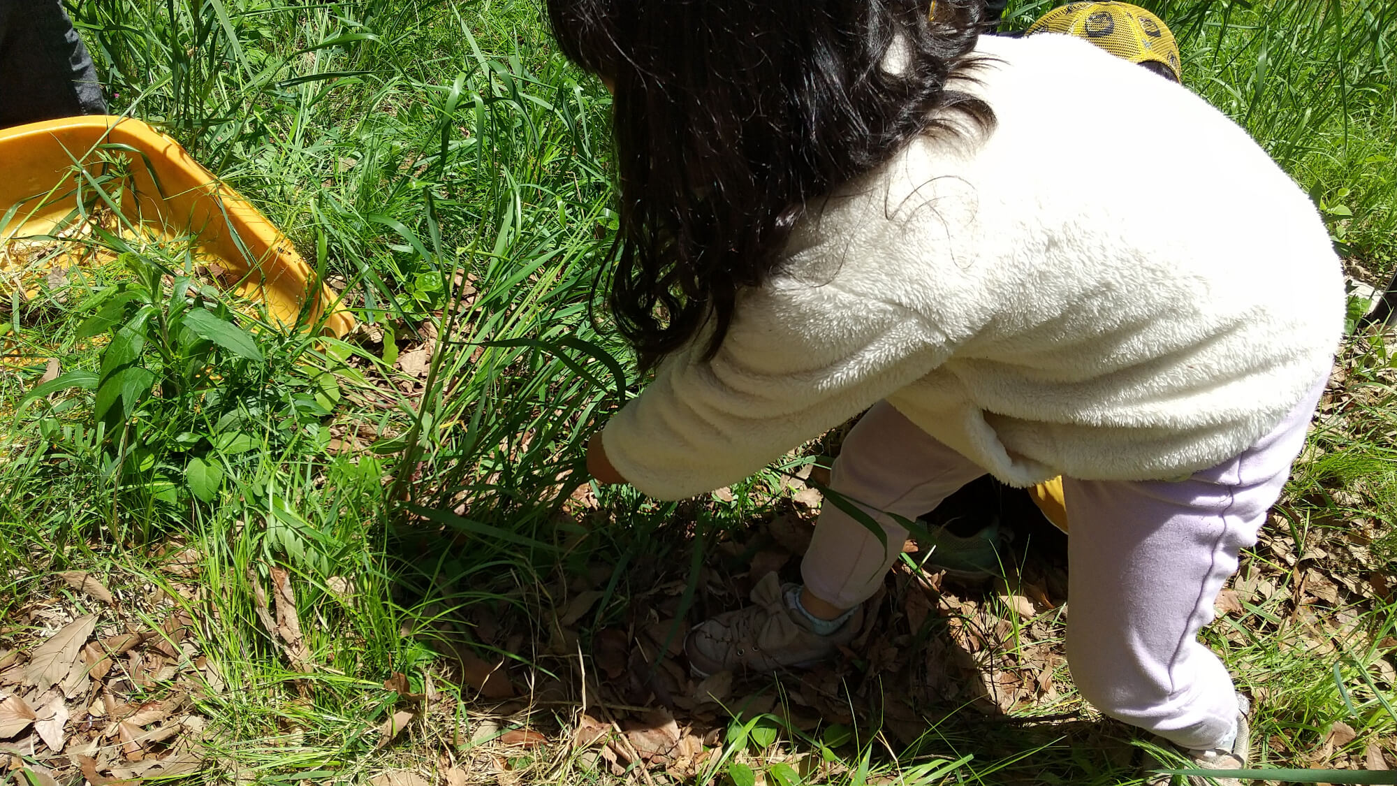 「ひとりじゃ大変だよ~」の言葉に、自然な流れで、「うんとこしょ、どっこいしょ」「まだまだ、葉っぱはぬけません…」などのごっこ遊びから、友だちと協力して雑草を抜こうとする姿も見ることができました。