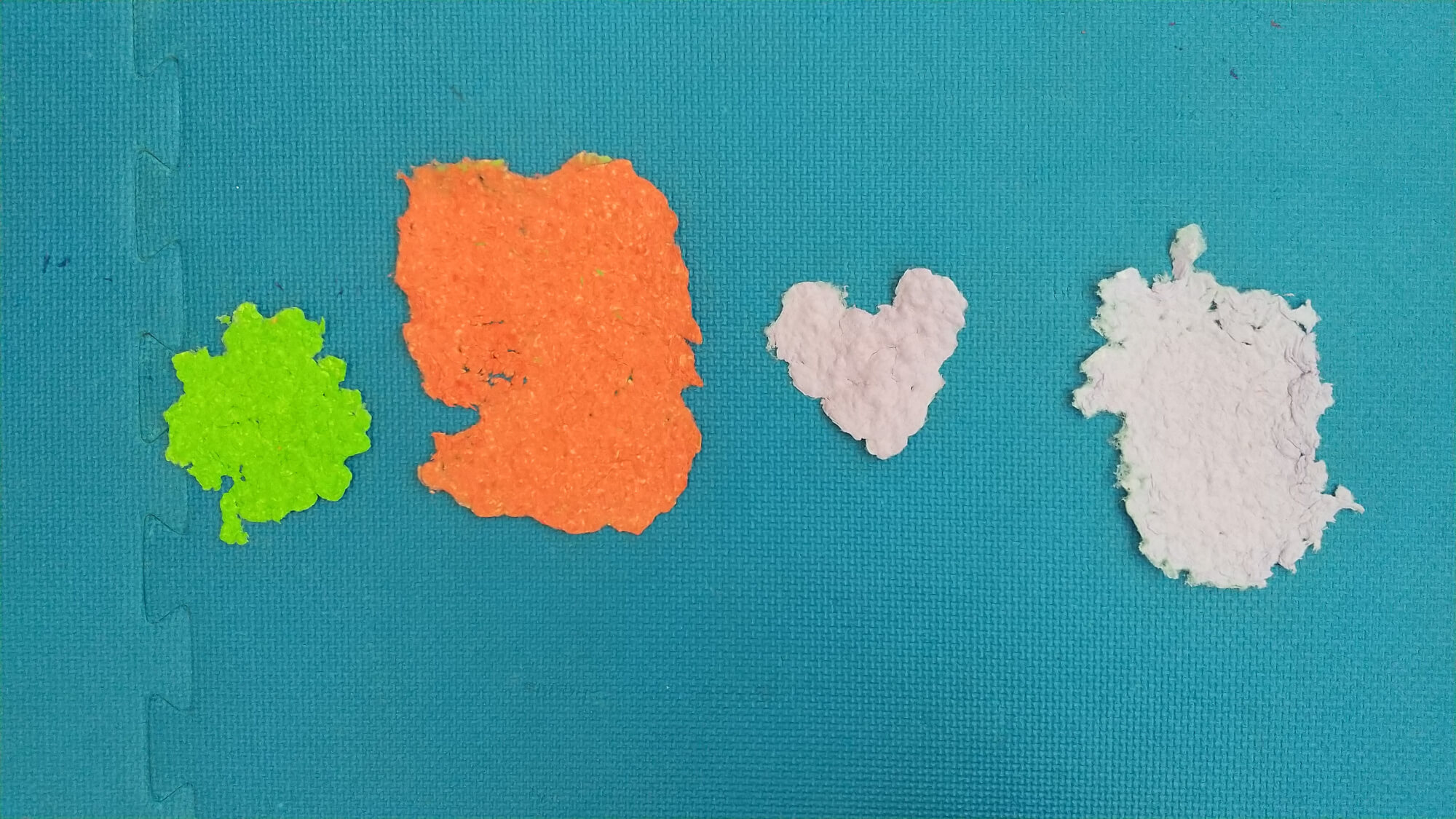 子どもたちは自分の作品を手に取り、硬くなった感触を楽しんでいました。「トイレットペーパーが無くなってるね」「溶けちゃったんだよ」と気付いた子もいました。