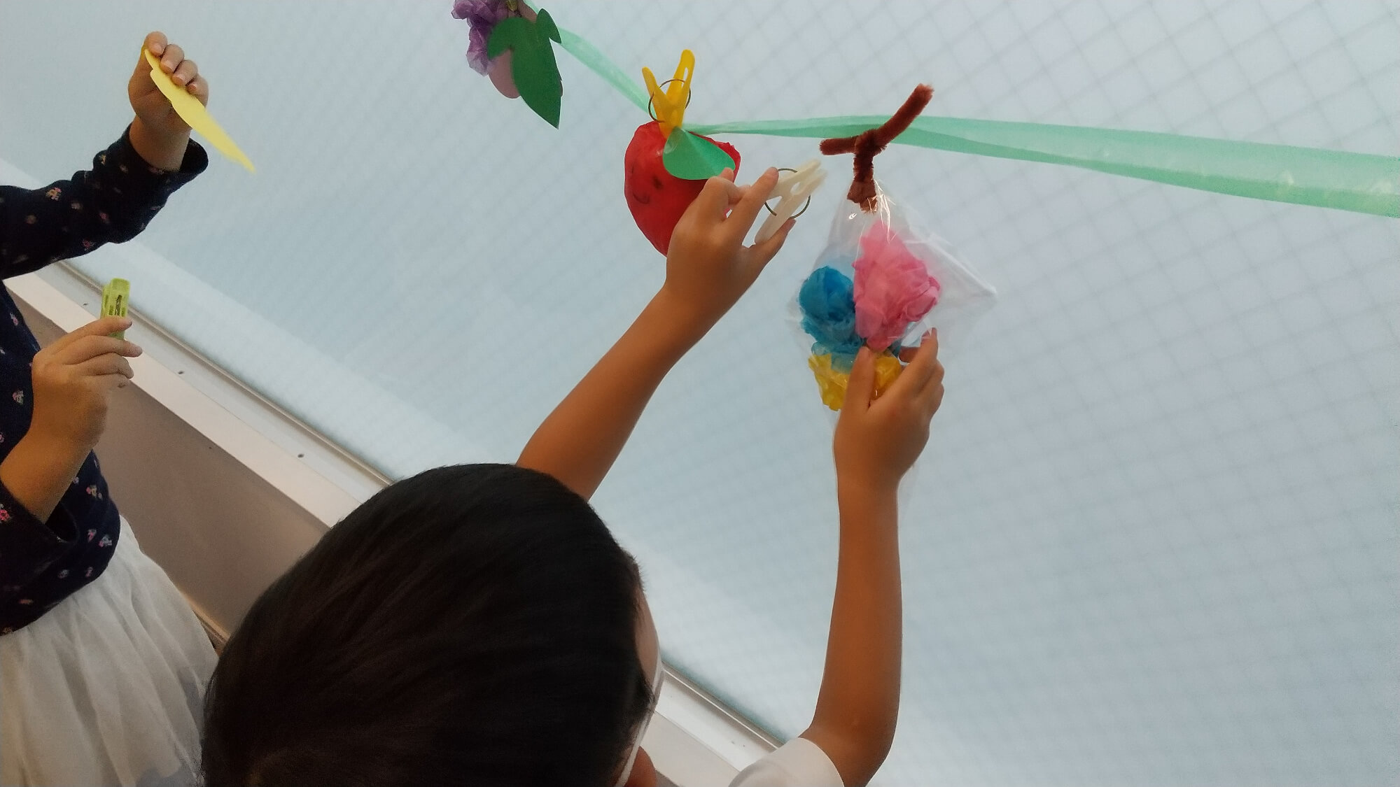 果物ができたら、みんなで飾り付けます。窓にスズランテープを貼り、作った果物を洗濯ばさみで挟んでいきます。
