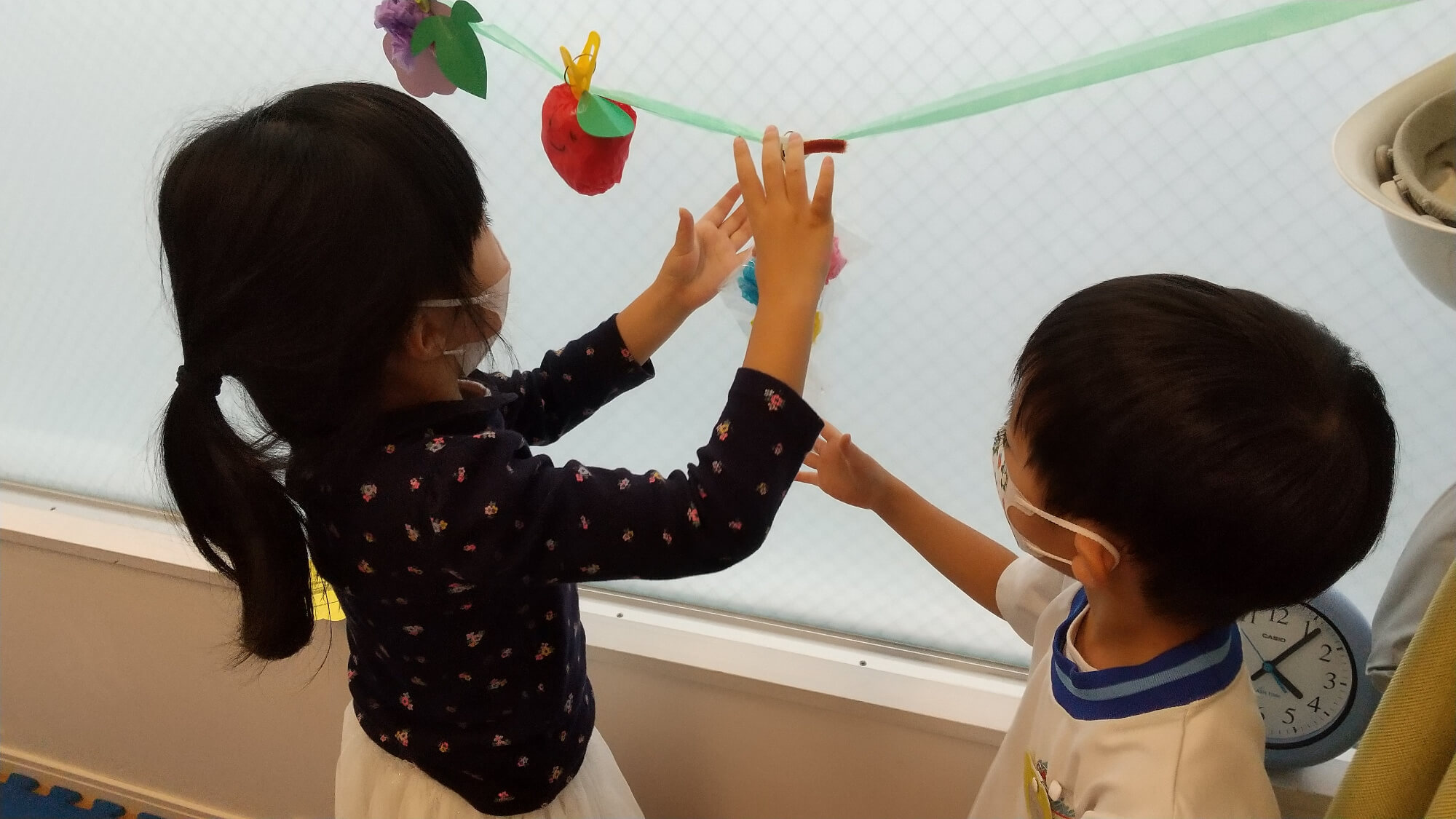 高い所に飾りたいけれど、年少児の身長では難しい時もあります。それを見た年長児が、代わりにその子の作品を飾ってあげる場面もありました。