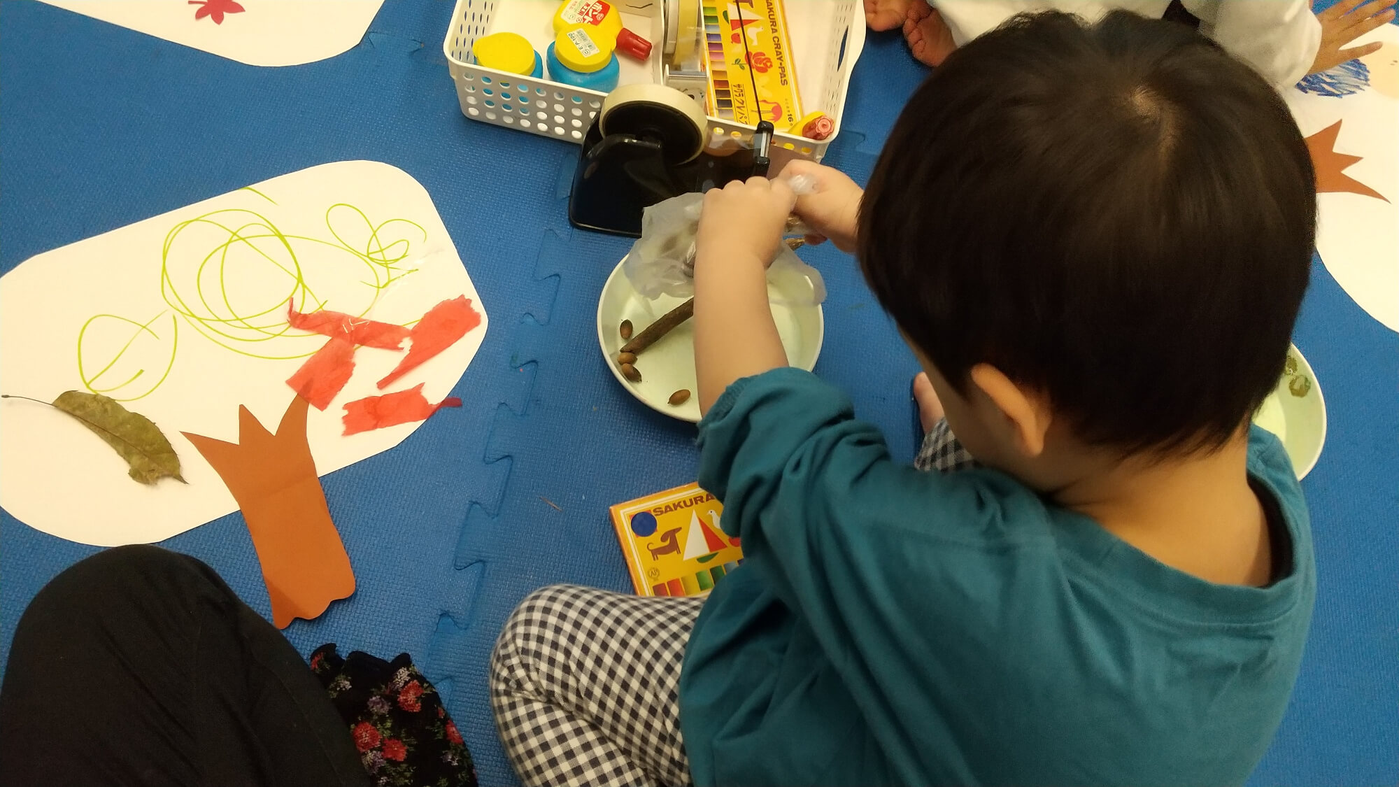 子どもたちは葉っぱをどこにくっつけ、クレヨンでどの色を塗るといいかなどと構成を考え、それぞれに工夫しながら製作に取り組みました。