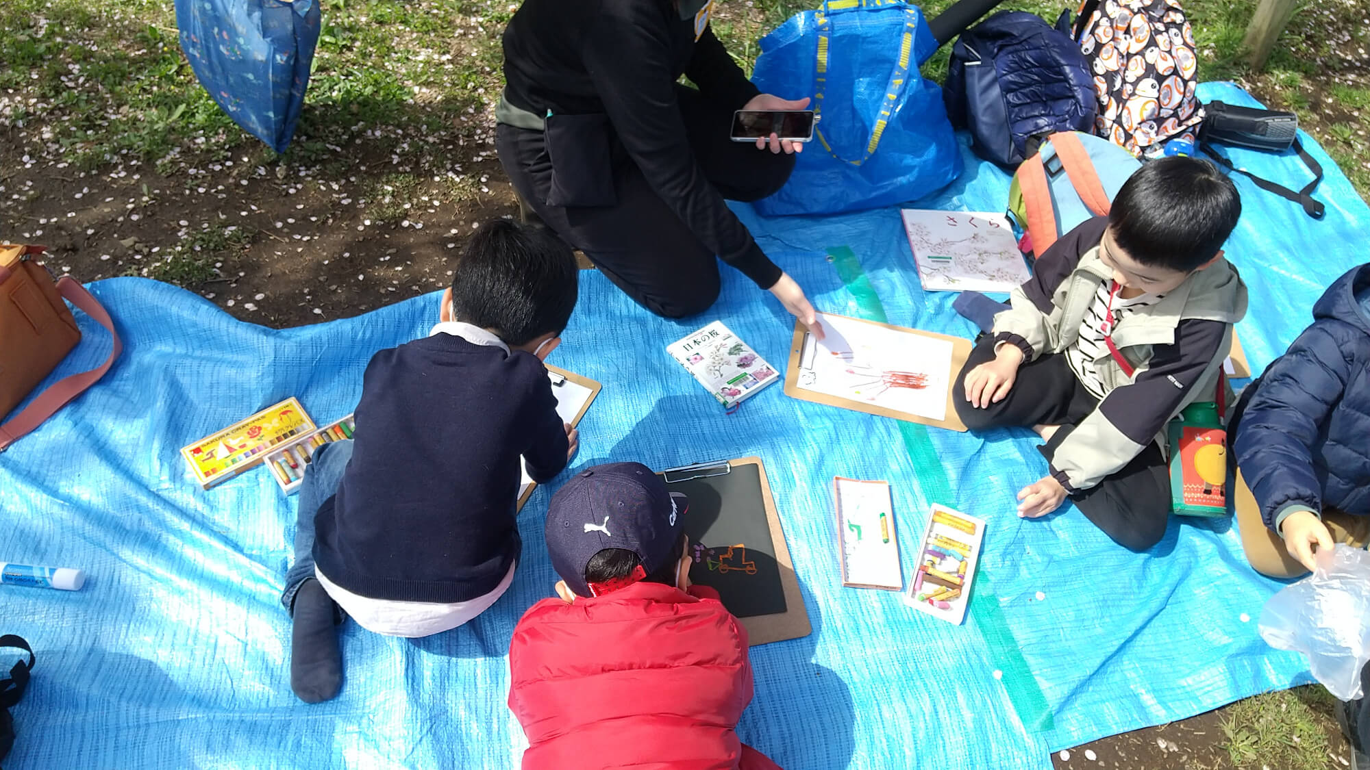 はじめに、桜の絵本を一緒に読みました。子どもたちは、「桜の花が終わって夏になると、虫やセミがくるね」「秋は葉っぱがきれいな色に変身するね」などと関心が広がってきます。