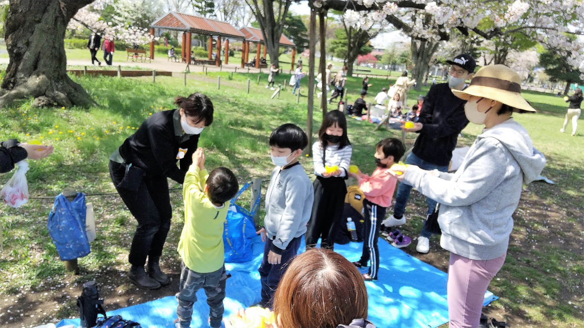 「みんなの手にも、たんぽぽが咲くかな 」とスタッフから黄色のハンカチをもらい、「たんぽぽ、たんぽぽ た~んぽぽ」と一緒に歌います。子どもたちも一斉に両手を広げると、「あった~」と青空の下、こぼれる笑顔と共にみんなの手にも、たんぽぽがいっぱい咲きました。