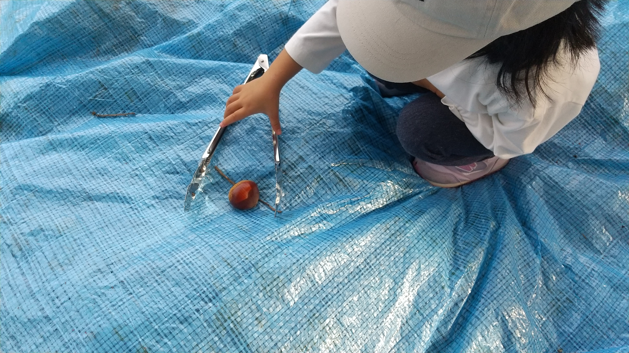 「どこを持ったらいいのかな?」子どもたちはトングを両手や片手で操作したり、栗の横や上から挟んでみたりするなど、いろいろな方法を試します。挟んだ栗が落ちてしまい「あ~あ」とがっかりする友だちを見て、「いいこと考えた!カゴを近くに持ってくればいいんだ!」と言い、運んできてくれる子もいました。無事にかごの中に栗が入ると「やった!」と喜び合っていました。
